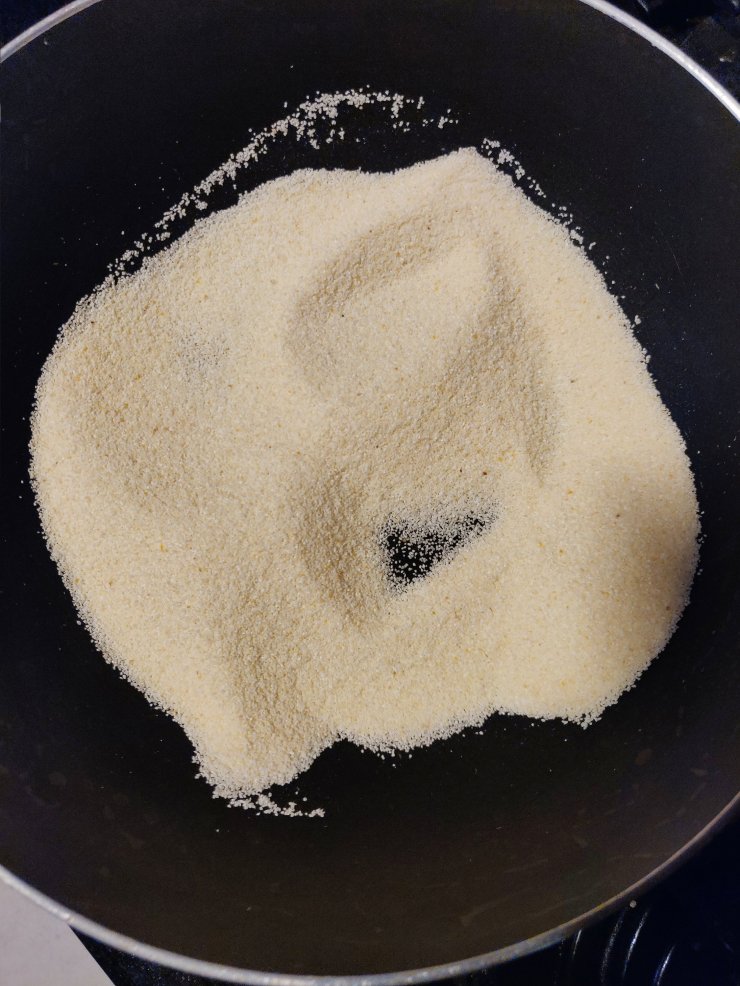 - Heat a wok and add the sooji (semolina) to it. On medium heat, roast the sooji for 2-3 minutes till it becomes drier, separates and is fragrant. Keep stirring during the process, the sooji should not brown. Once done, transfer to a plate and set aside.