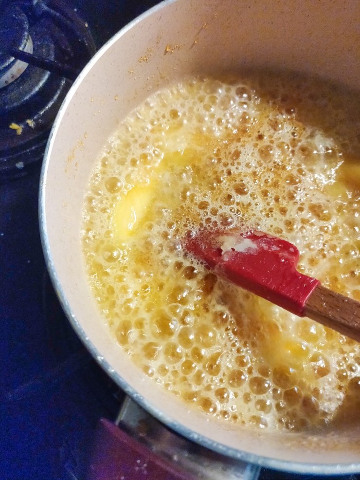 The sugar takes it’s time to melt and become this gorgeous dark golden colour. You need to keep stirring to ensure it doesn’t burn and to break up the clumps. Watching it transform from white to gold is like magic!