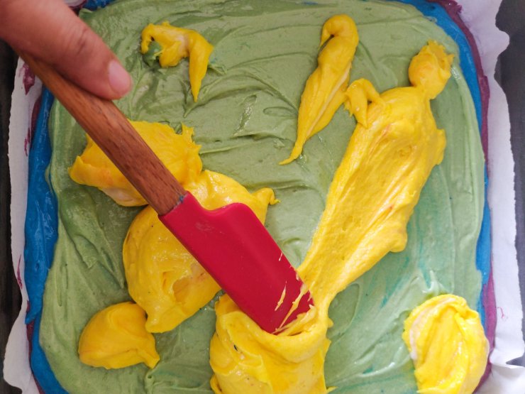 - Transfer the batter to the pan, layer by layer, and spread each layer out (start with purple, then blue, green ,yellow ,orange and red)