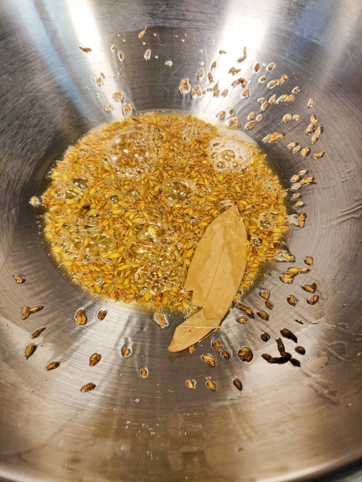 - In a large pan, heat the ghee. Add the bay leaf, cumin seeds, fennel, cloves on low heat