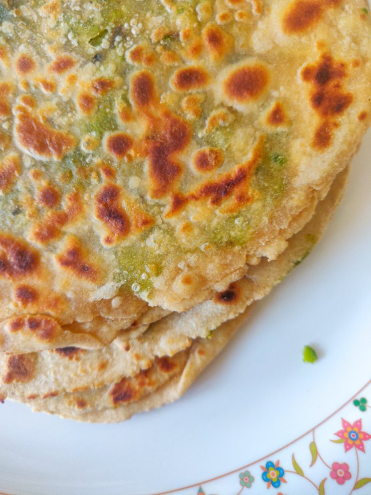 Paranthas are an essential part of any Delhi child’s diet. Any North Indian child, possibly. But Delhi child for sure. Whether at home or at friend’s houses or when on road trips or just at dhabas on a whim. Paranthas scream comfort and decadence. The gorgeous varieties of stuffings, the lovely mix of spices, the soft dough and that ghee/butter. Yum!While potato, cauliflower or radish were the common ones at home, I’ve tried many other flavours over the years as well. This one is spiced peas and is not only super tasty but also makes the paranthas look beautiful, with specks of green throughout.