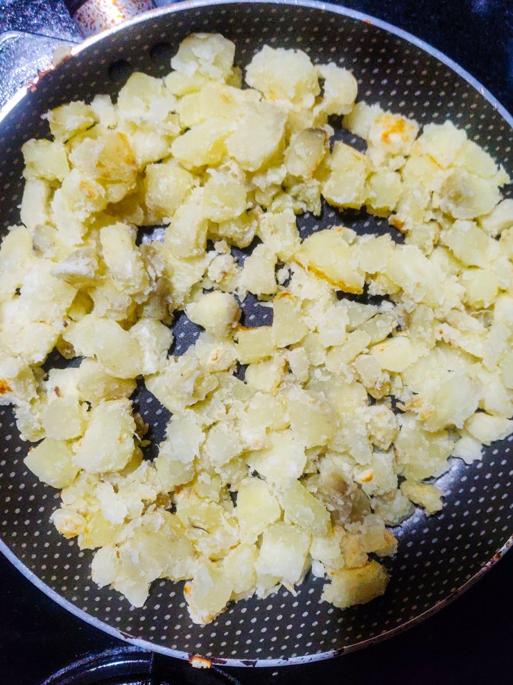 - Drain and cool the potato. Then peel and cut into 1/2 – 1 inch cubes
