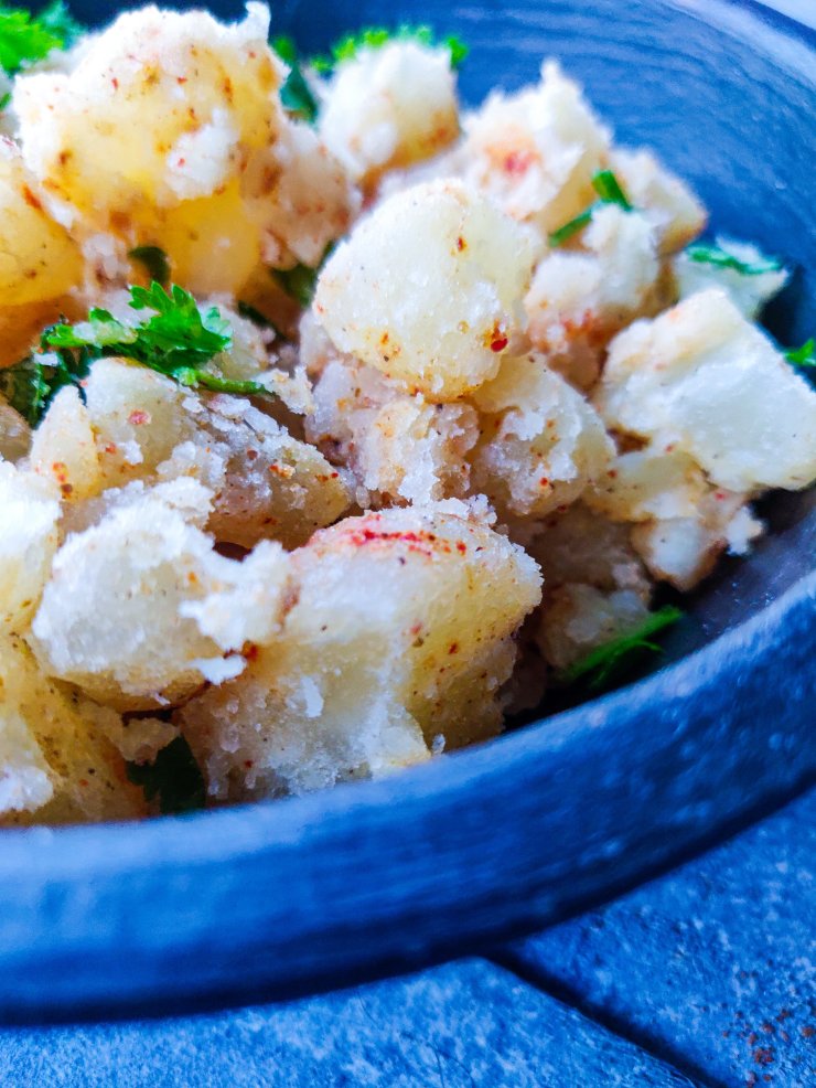 - Transfer the potatoes to a bowl and toss with all the spices and lemon juice. Adjust salt. Garnish with fresh coriander. Serve!