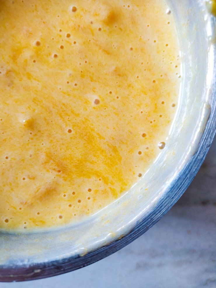 All this needs is mango puree, whipping cream, condensed milk and vanilla essence. The whipping cream, once at medium-stiff peaks, is what gives it that light as air creaminess and makes this feel like good ol’ ice cream.