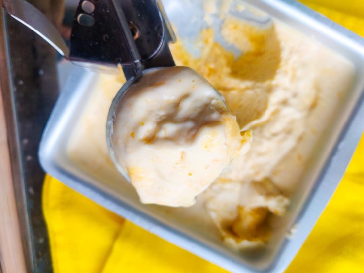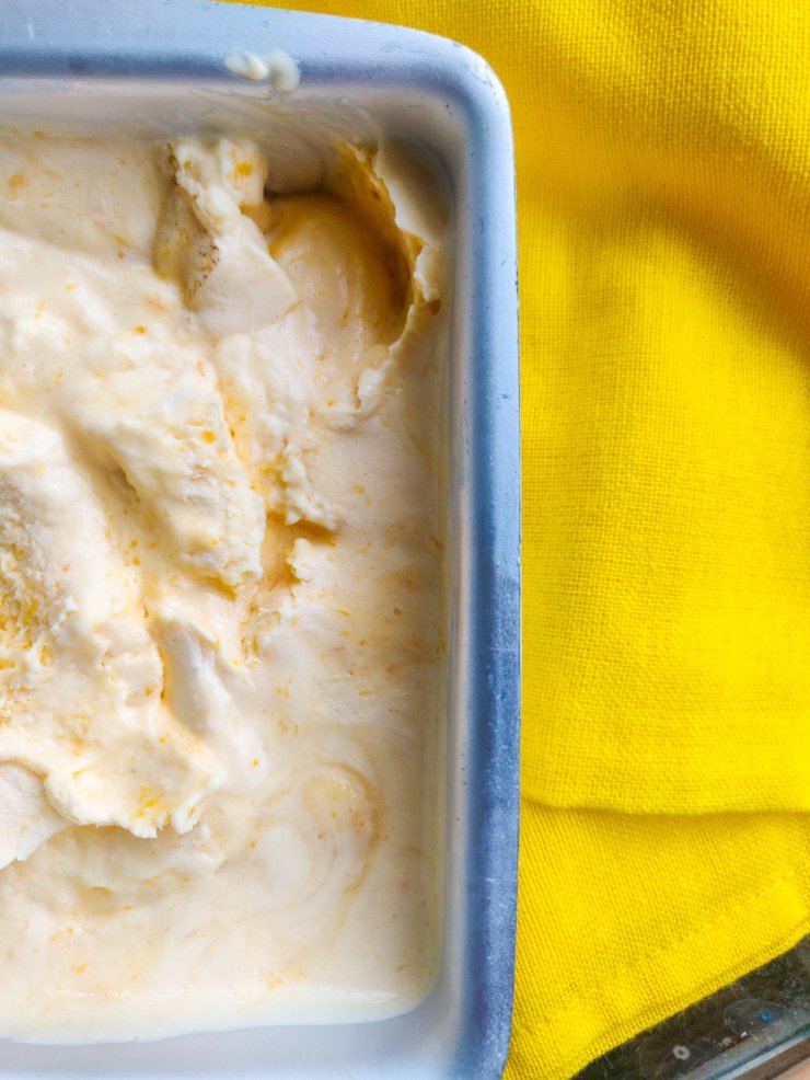 You’ll beee flecks of darker yellow through this pale golden ice cream. It won’t be a bright yellow because there is no added colour and it’s just cream and puree largely.