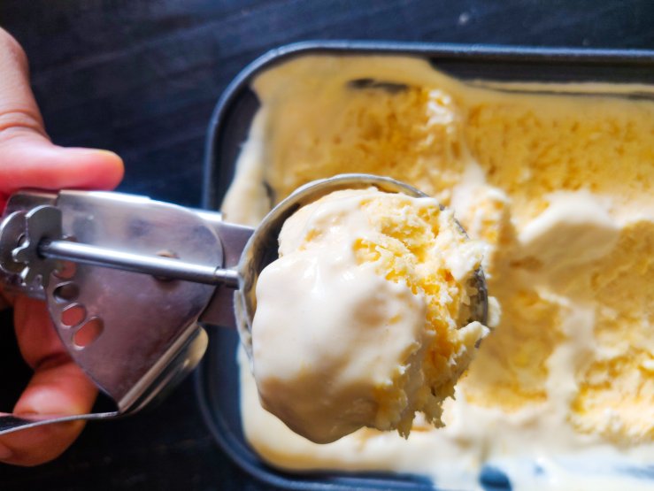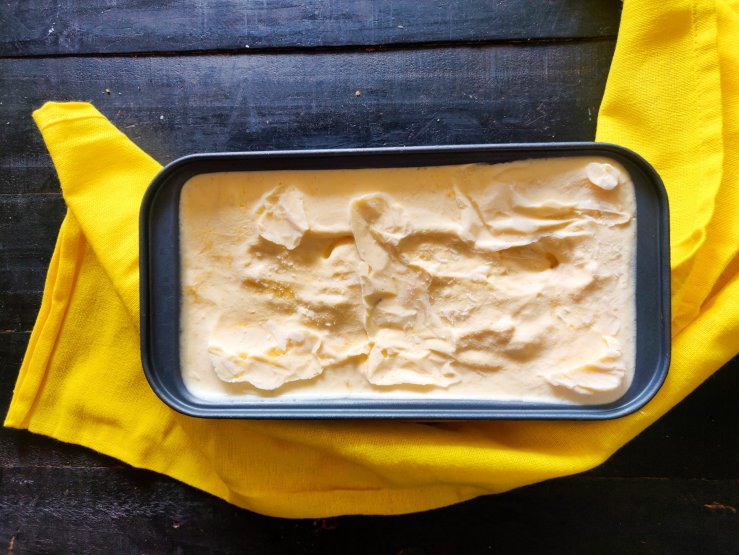 The whipped cream is incorporated into a mix of fresh mango puree and condensed milk to make the ice cream. That’s it. Freeze it for 6-8 hours and you’re good to go!