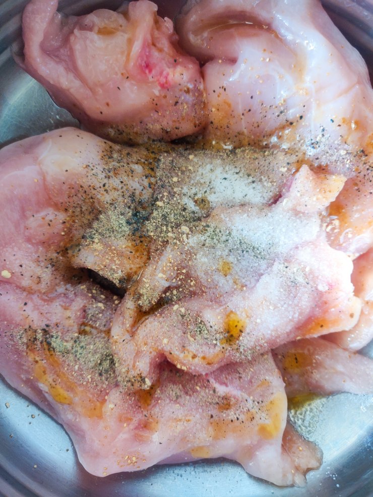 - Wash and pat dry the chicken. Marinate with 1 tsp salt, 1 tbsp olive oil, 1 tsp black pepper and 3 garlic chopped garlic cloves. Let it rest for 20 minutes