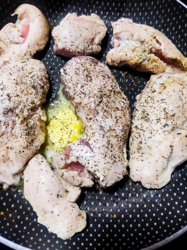 The chicken is marinated in salt, pepper and garlic to give it a little extra oomph and then cooked with a little butter and thyme. Because, why not? 🙂