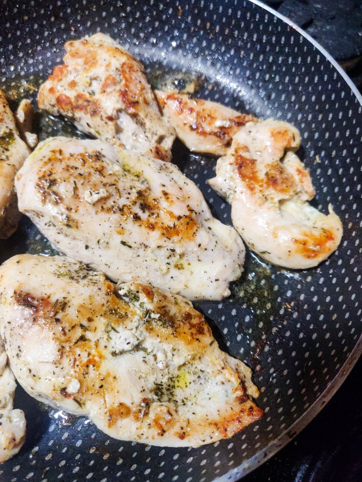 - Once ready, heat a non stick pan and place the chicken breasts on it. Let it sizzle and cook for 5 minutes per side till it becomes white-ish and opaque