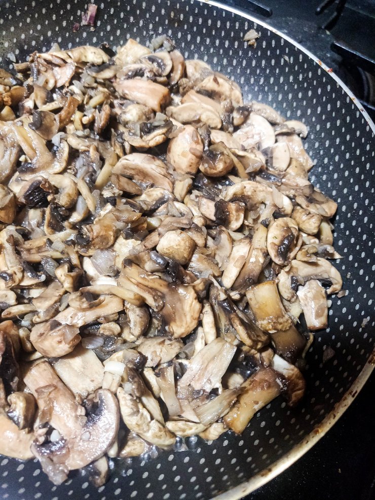 - Add the chopped mushrooms and cook on high heat for 5 minutes till soft, browned but not mushy. Let the water evaporate and adjust salt