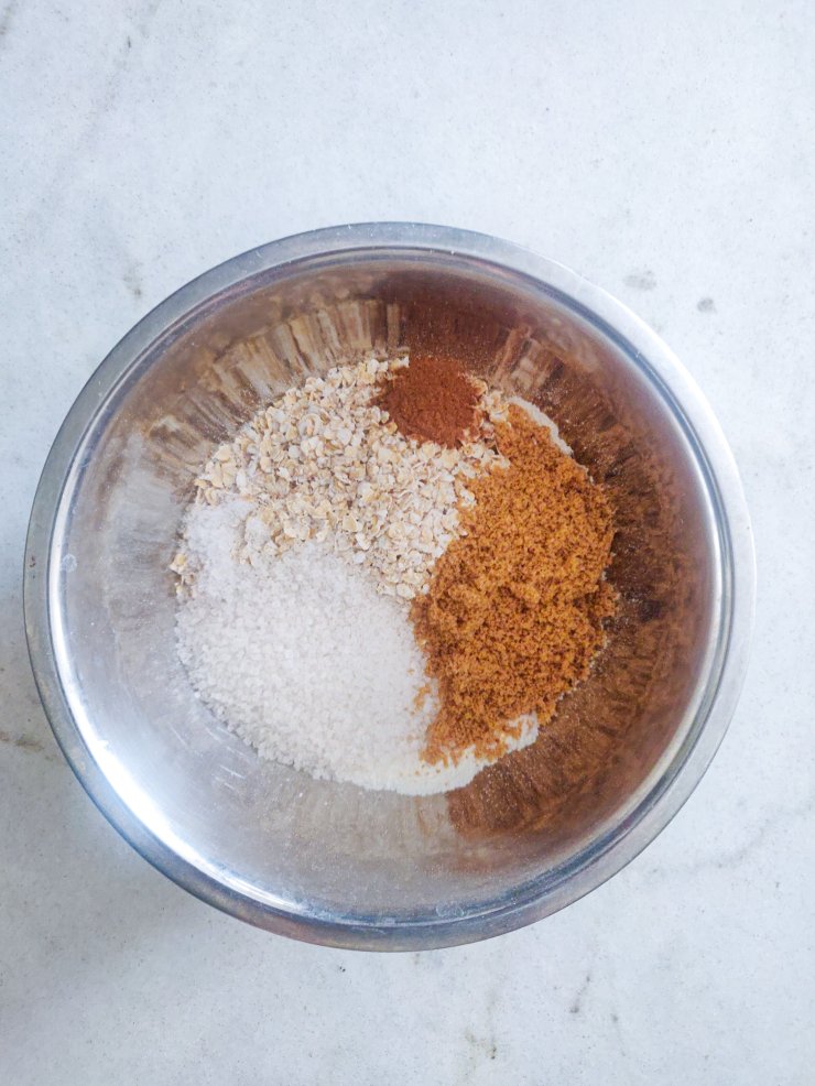 I used a mixture of flour and oats for this crumble and amped it up with a little cinnamon as well. Pulsing all these together and getting that nice, sandy crumb is so fun to do. You can use a food processor or just get in there with your hands. It’s quite therapeutic, I think.
