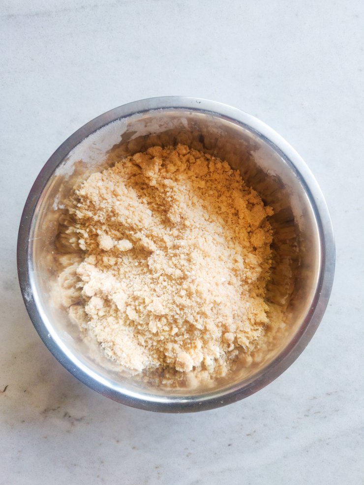 - Add the cold, cubed butter and either mix with your hands or pulse with the processor till you get a coarse,sandy mixture