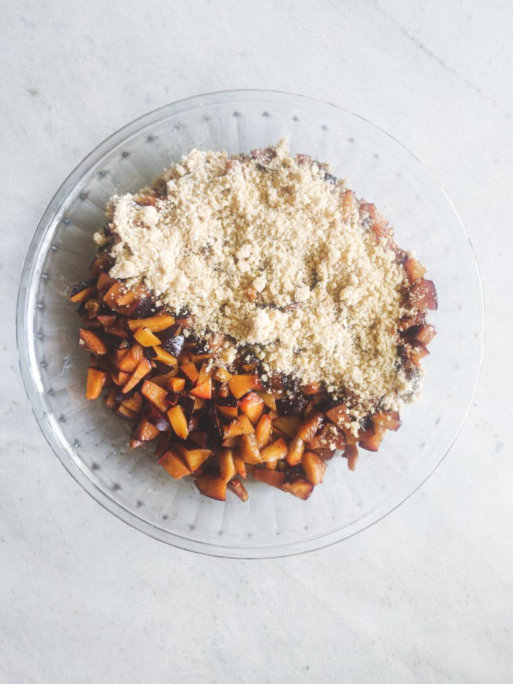- Transfer the plums to a 9 inch baking tin (preferably glass) and layer the crumble on top of it