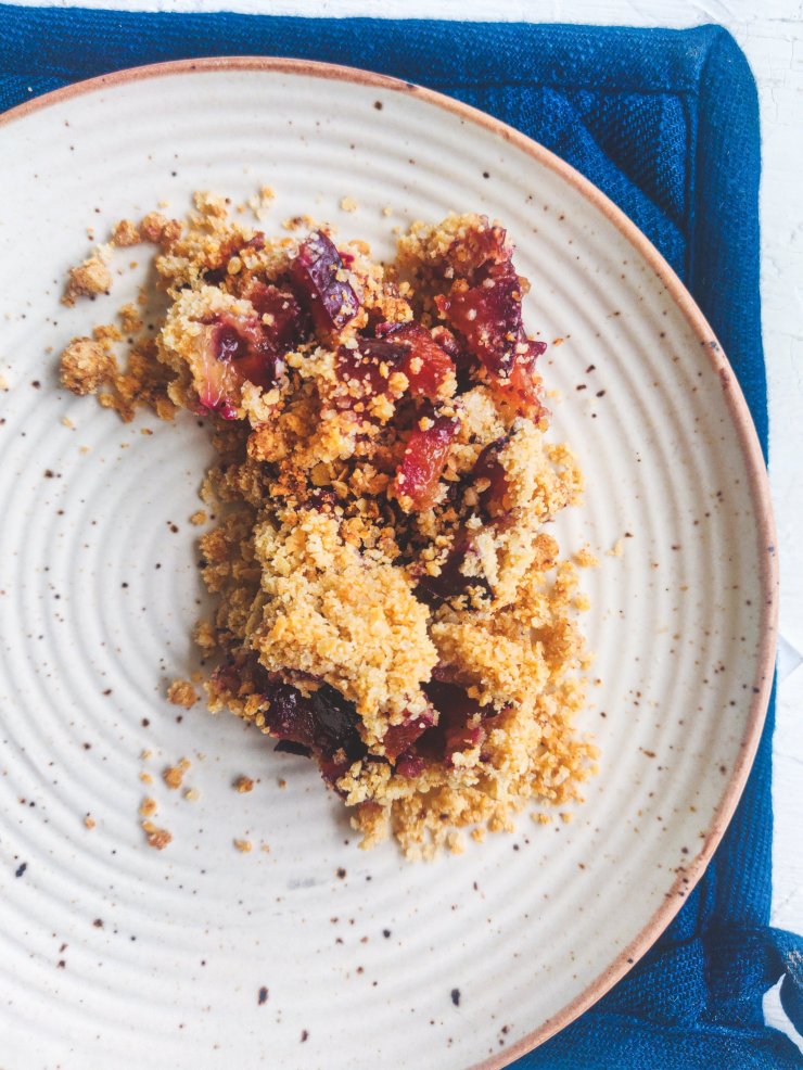 The plums get roasty and jammy while being aromatic and delicious. The crumble is golden, buttery and toasty. All in all, this is pretty darn good!