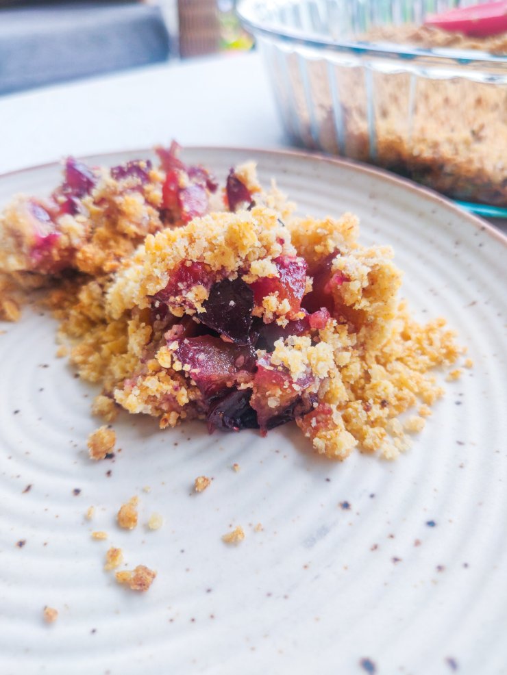 - Bake at 200C for 50-60 mins till the crumble is golden brown and the juices start bubbling up around the sides