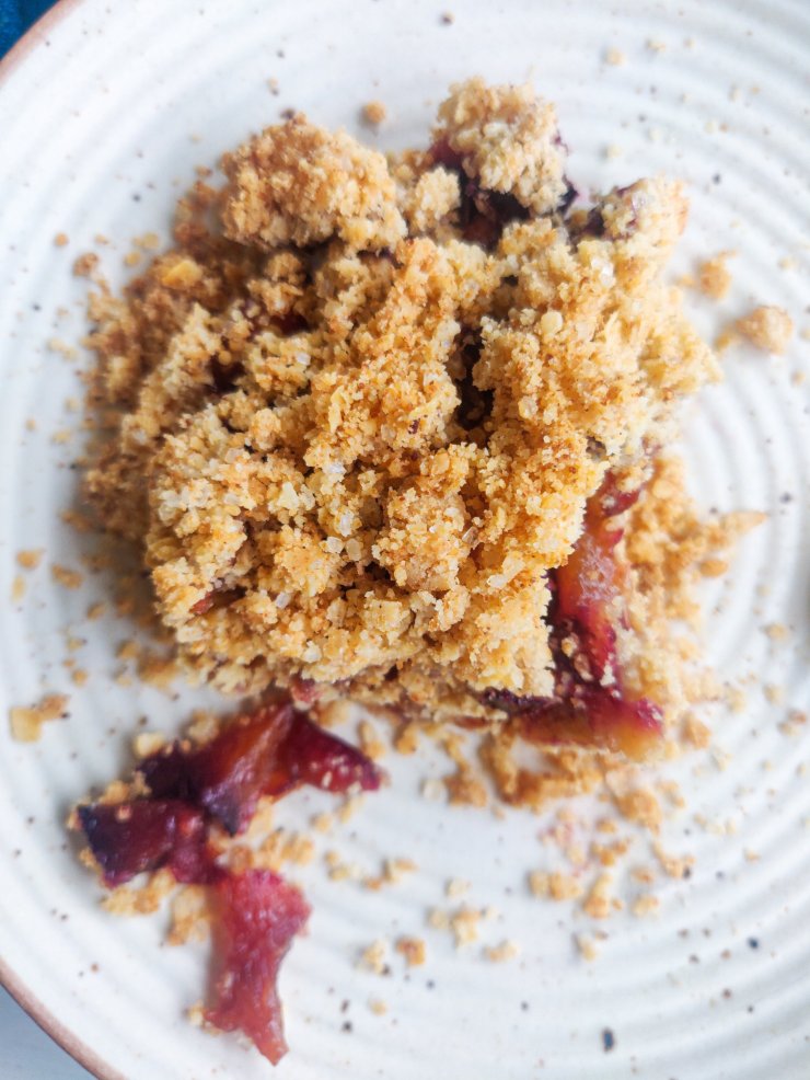 I’ve grown up watching a lot of international cooking shows and reading books by Enid Blyton which were massively focussed on food (those picnics, dinners and delicious sounding puddings!). While I didn’t get to eat a lot of those dishes at home, I pounced on the chance to try them as I grew older, either from upcoming bakeries or while traveling. Crumble, to me, is one such iconic dish. It sounded super delicious so I made sure I tried it when I saw it on the menu at a brunch, many years ago. I loved it! Buttery, crumbly, fruity and delicious, this was definitely worth learning. So here is one version, with plums and a little spice 🙂