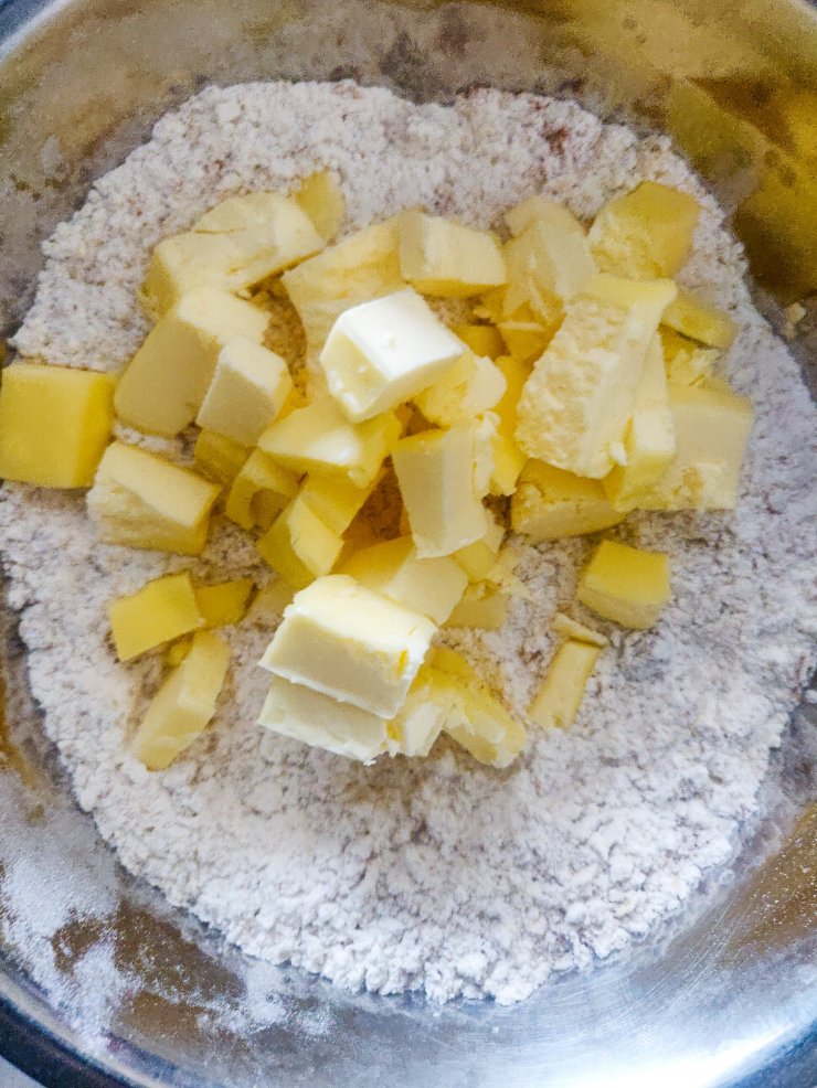 - Add the cold, cubed butter and either mix with your hands or pulse with the processor till you get a coarse,sandy mixture