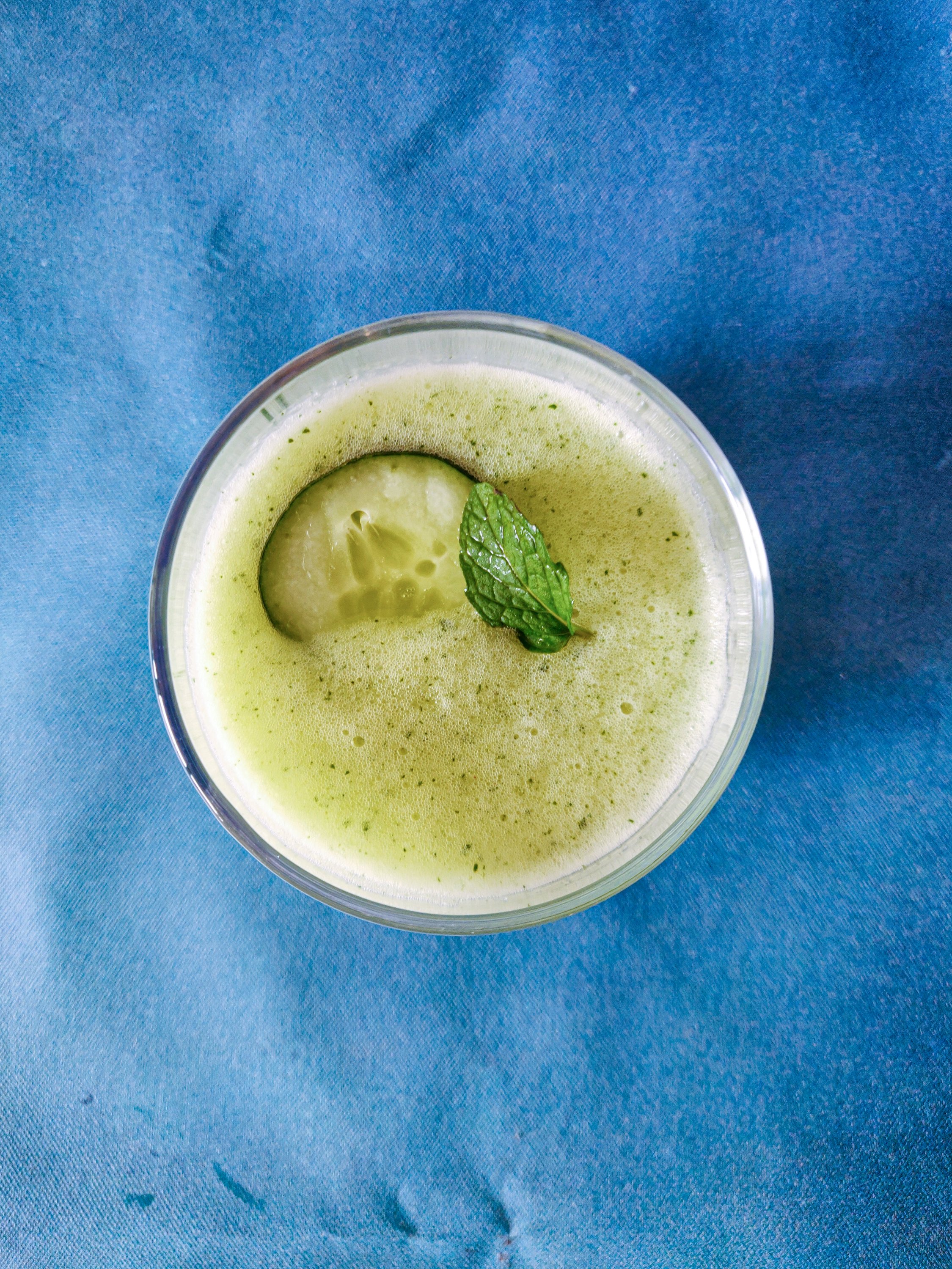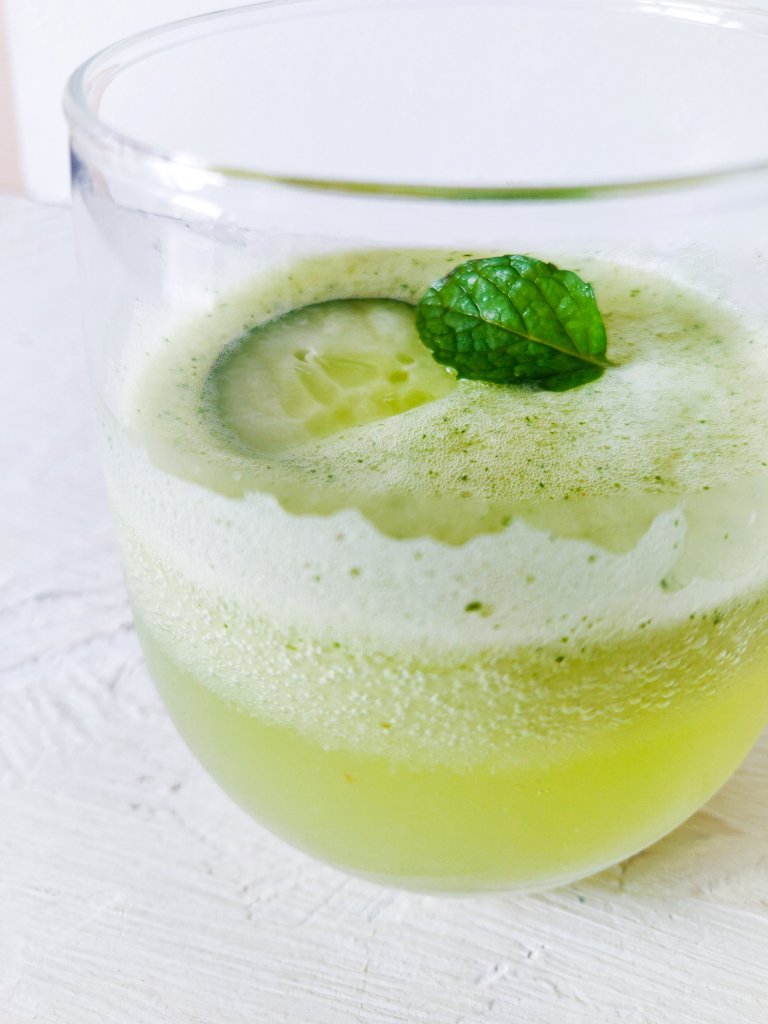 - Add two cubes ice to a glass, pour in the mix from step 3 and garnish with fresh mint and a slice of cucumber. Get ready to guzzle away!