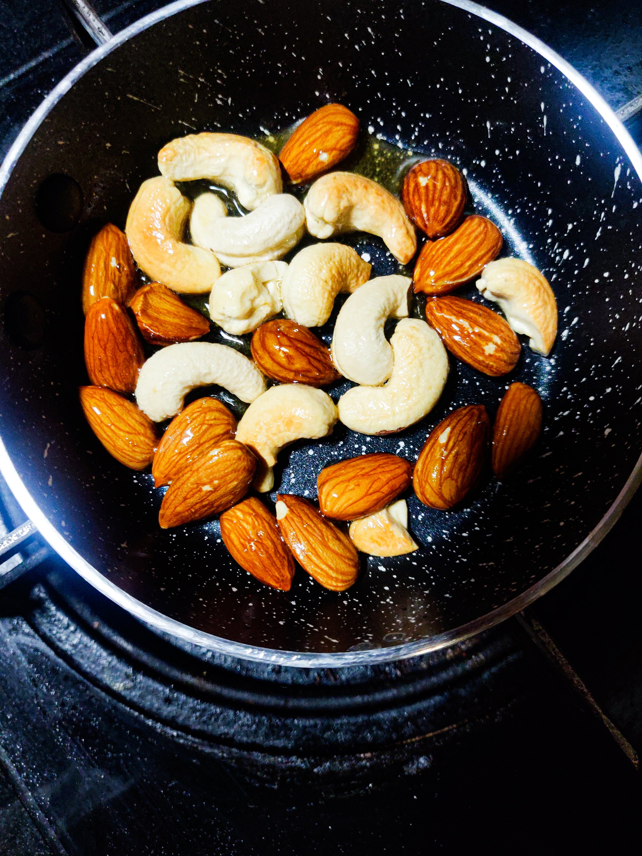 1. In a small pan, heat 1 tbsp ghee and roast the almonds & cashews till golden. Keep them aside