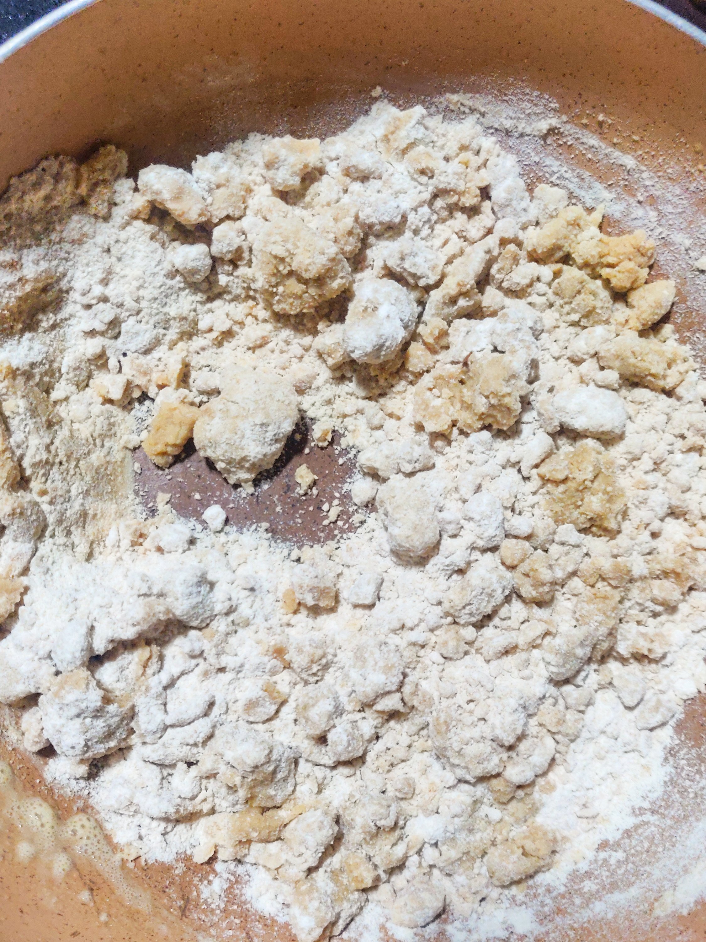 It starts as a pale flour mixture and then becomes this beautiful caramel brown. You can taste it to make sure it’s not raw and then take it off the heat and let it cool a bit, till it is only slightly warm.