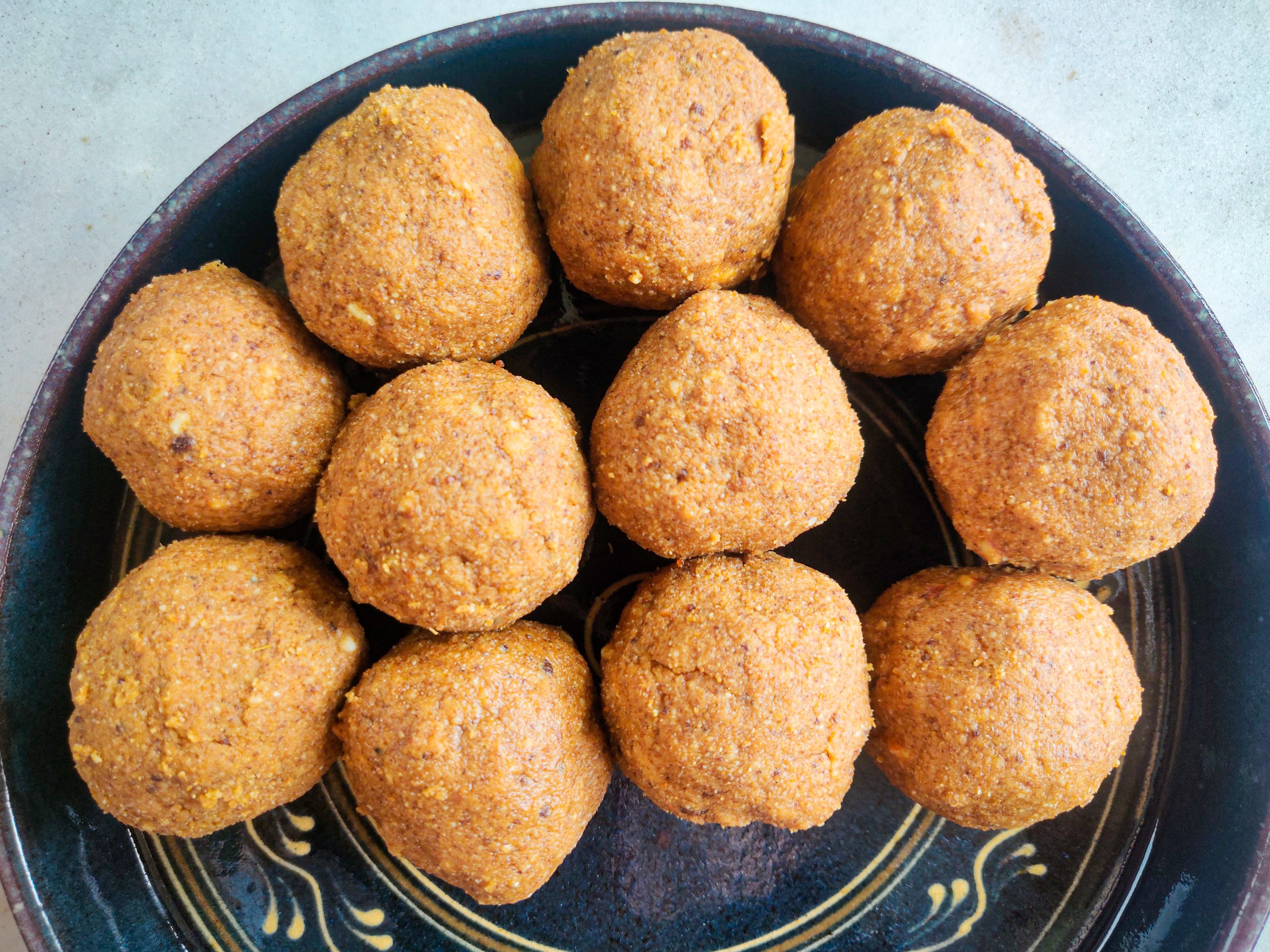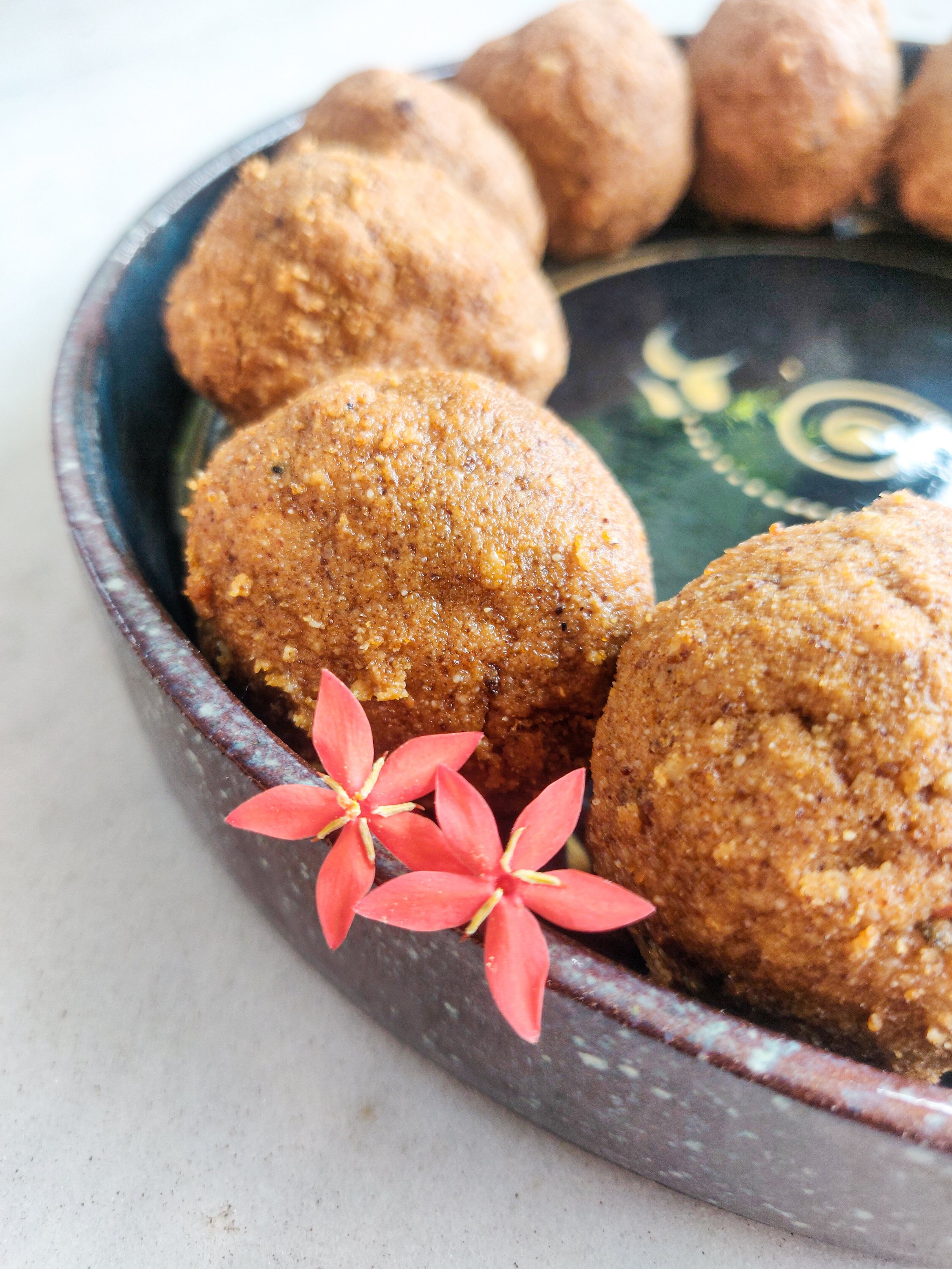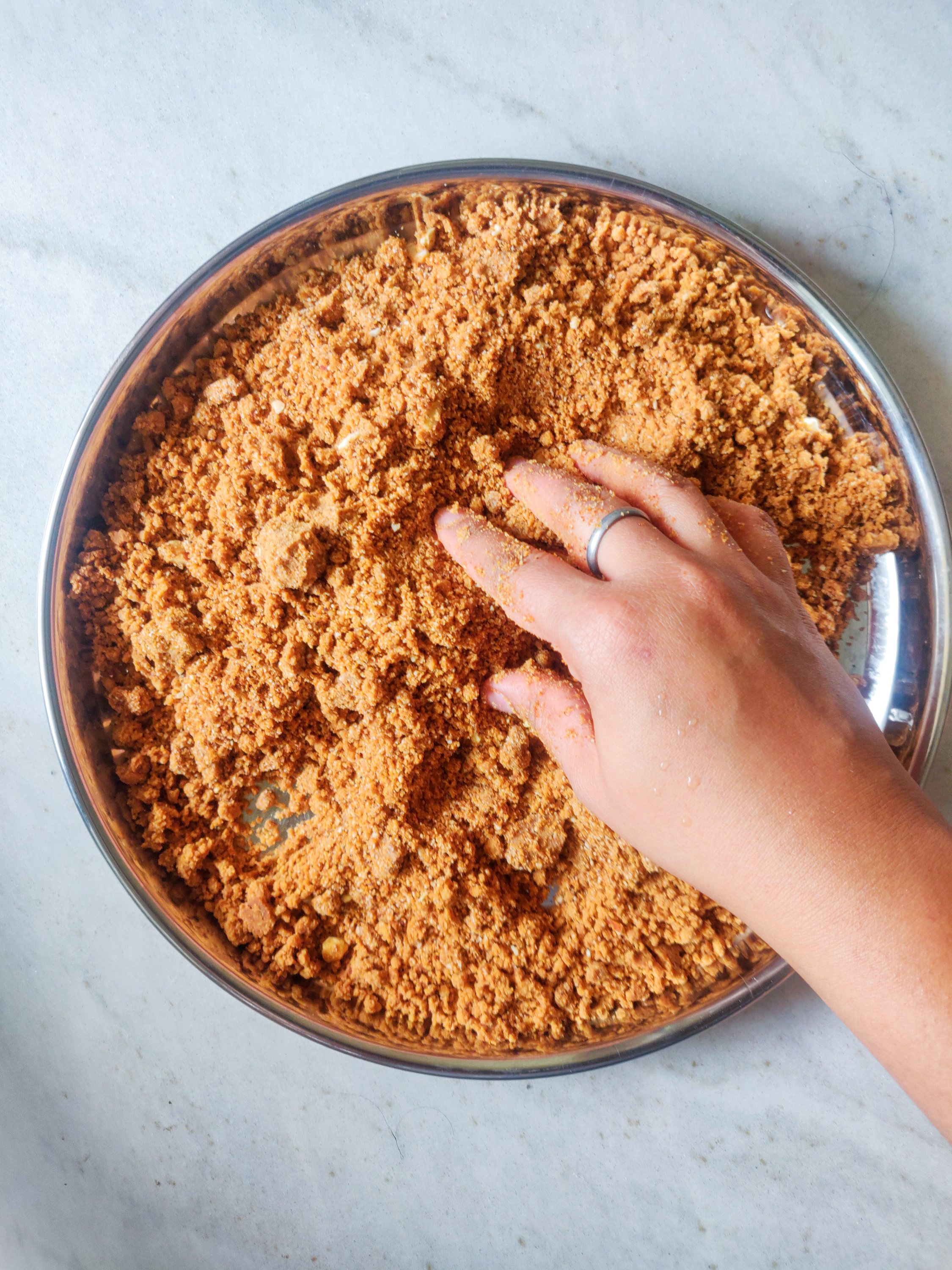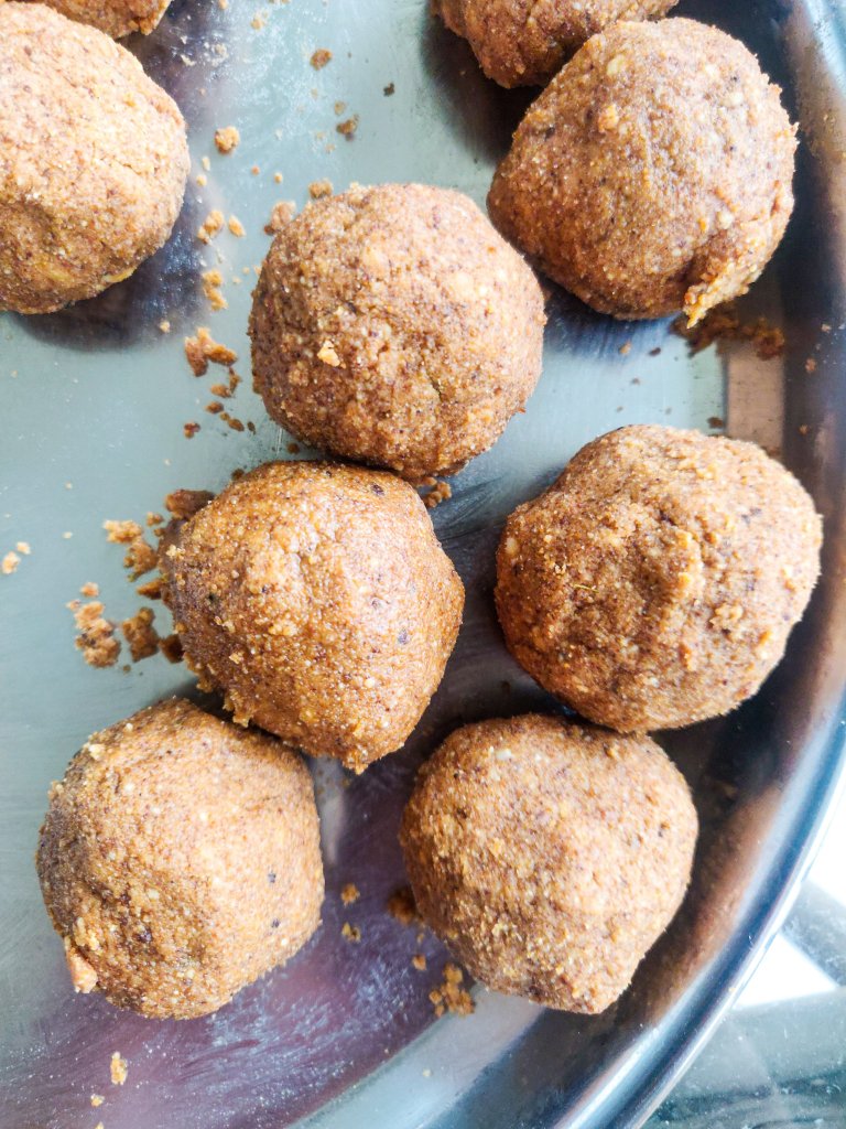 I’d seen people making ladoos by just using one hand to roll the ball. Turns out it is easy and super efficient! You need to form a ball and then just roll it back and forth on one palm till it forms a ball. You can also use the other hand to pat it into shape if you need. Easy, peasy!