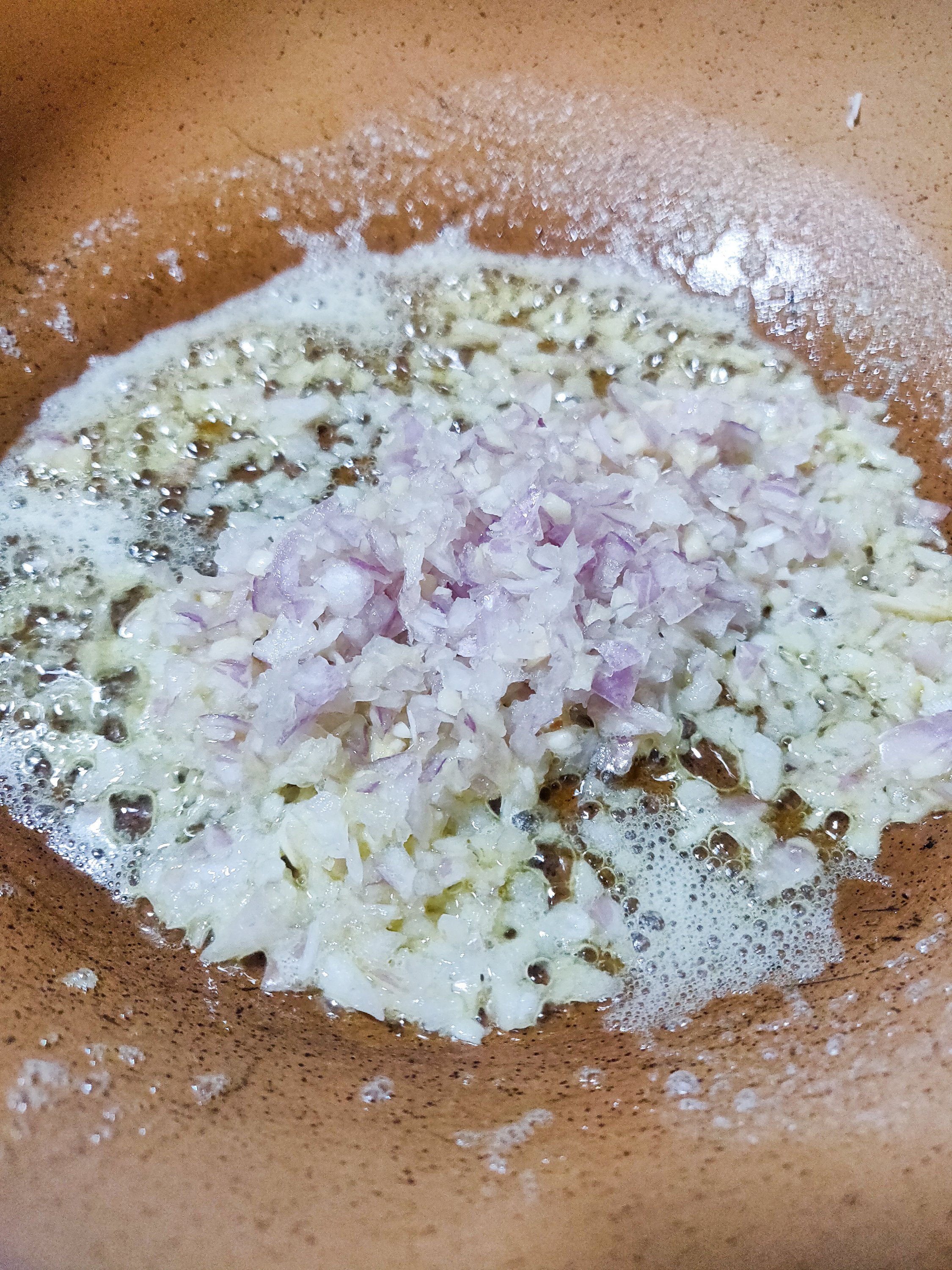 - Add the onions and garlic and saute till the onions become soft and translucent