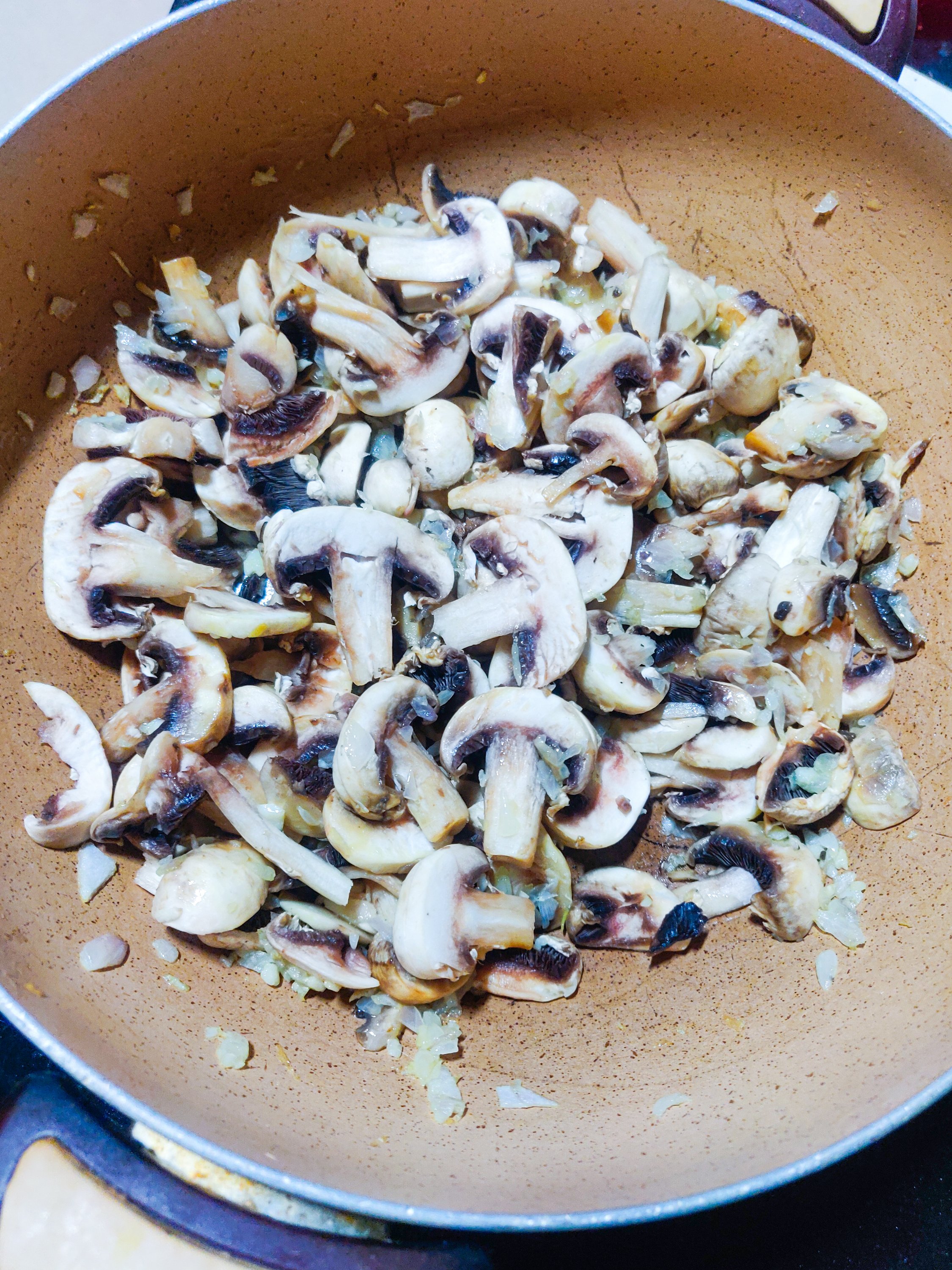 Once these are sweated down and soft, in go the mushrooms, which are then sauteed till cooked through.