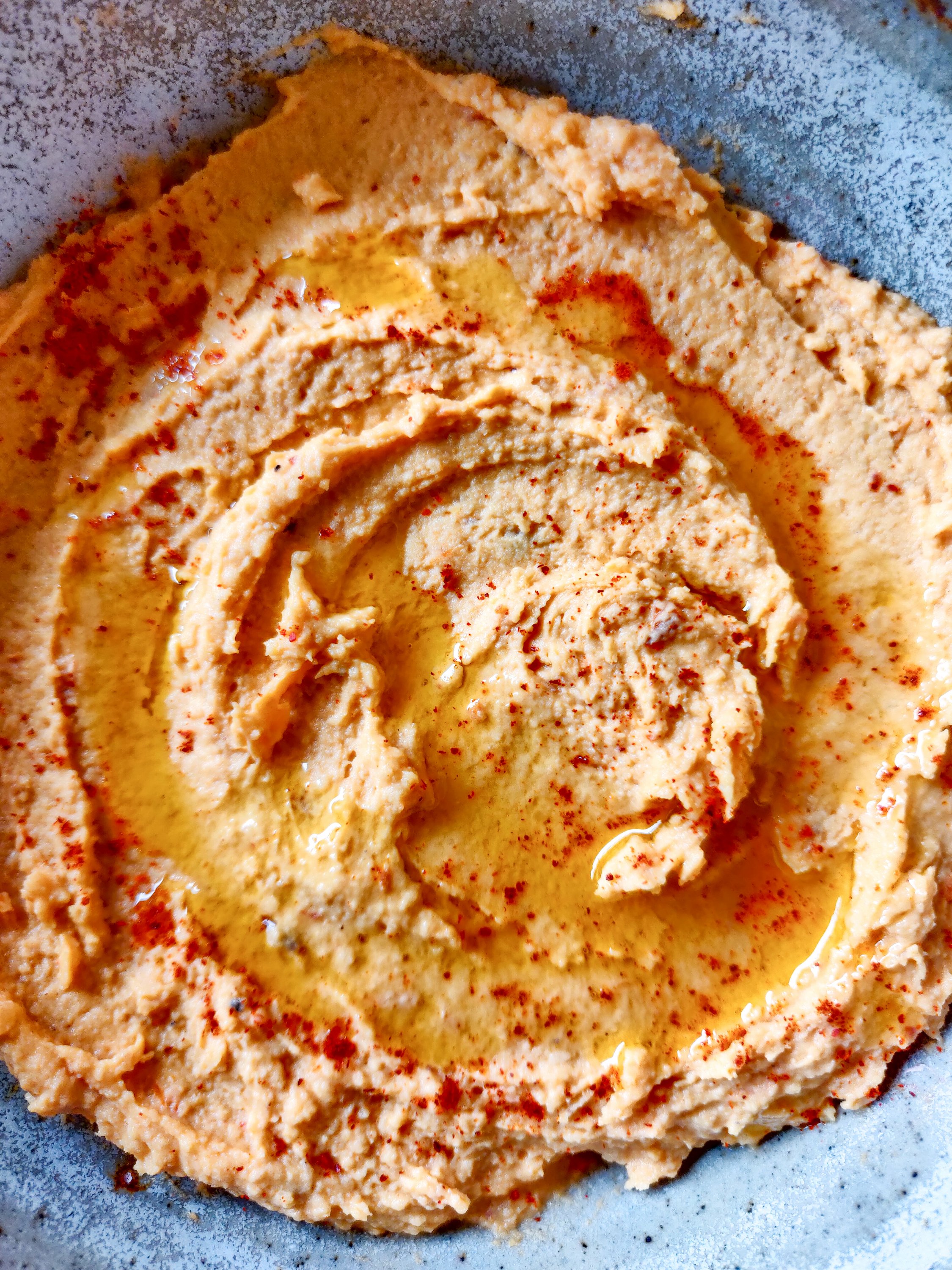 To the peppers and chickpeas, add the usual suspects (garlic, tahini, salt, olive oil, cumin, chilli, lemon juice and cold water) and blitz away till smooth. Let it rest and refrigerate before serving.