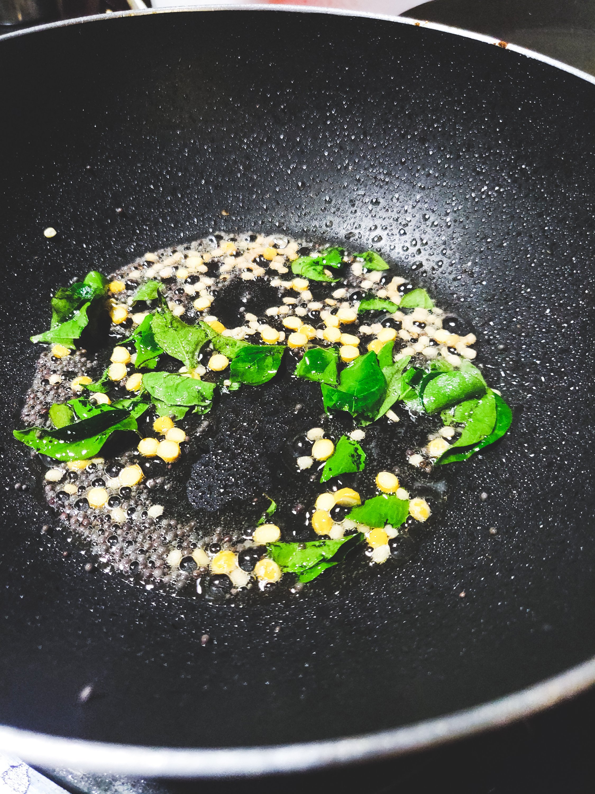 1. Heat oil in a kadhai/wok. Add the mustard seeds, urad dal, channa dal and let them splutter