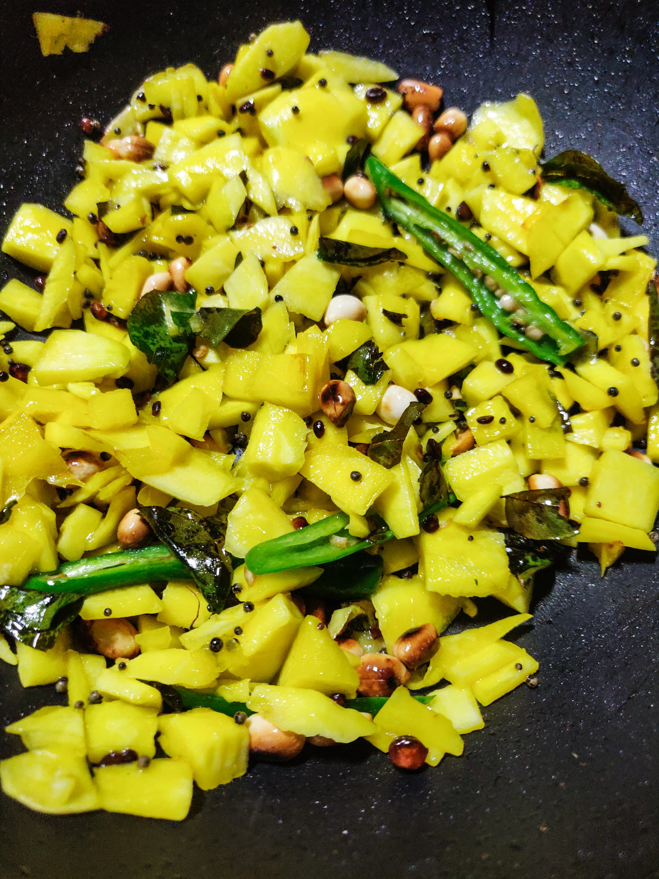 The raw Mango gets cooked down for a few minutes to absorb all the flavour and to become softer in texture (not mushy).