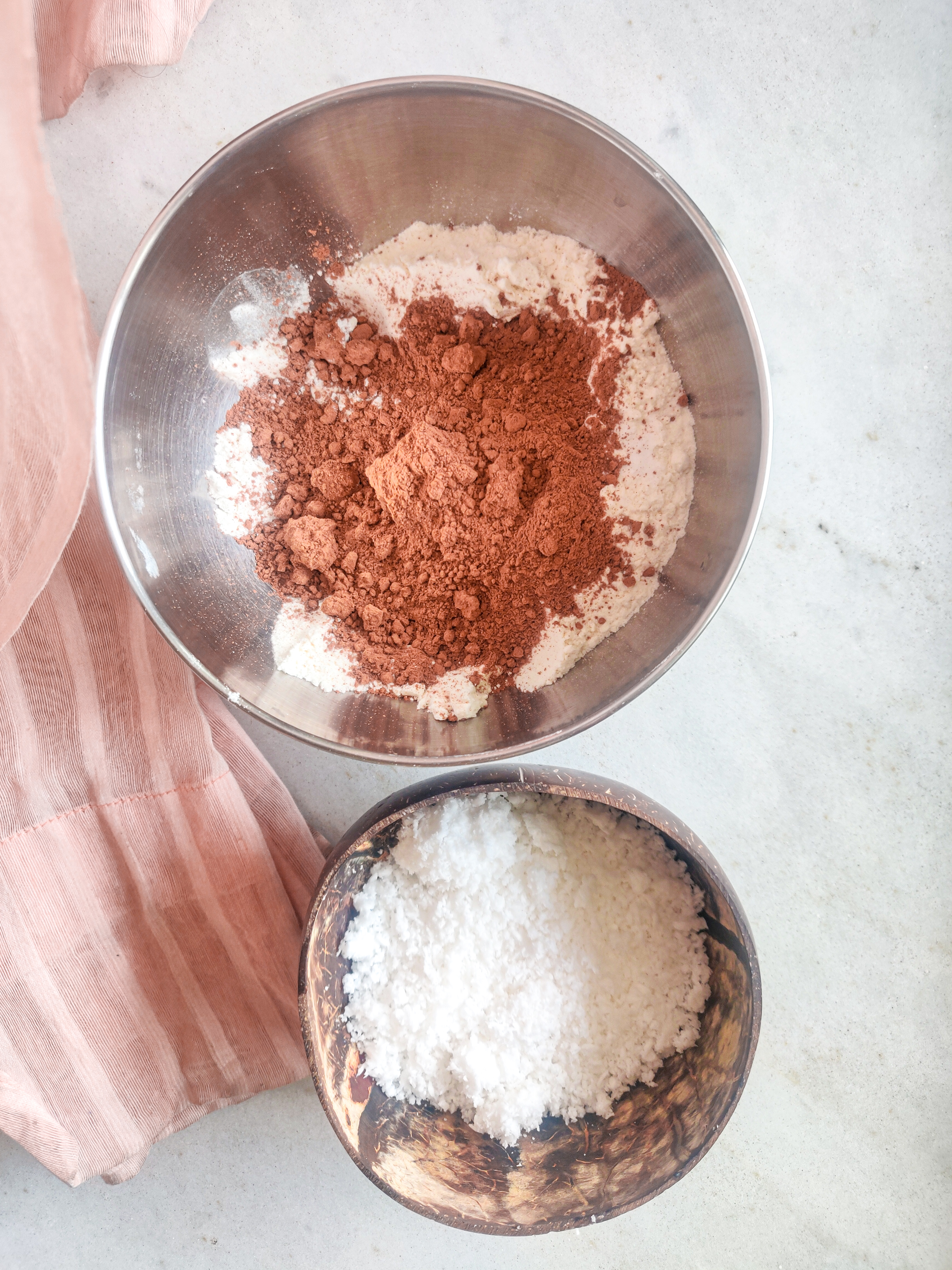 - In a small bowl, sift the flour and cocoa powder. Mix in the salt, baking powder, baking soda and grated coconut