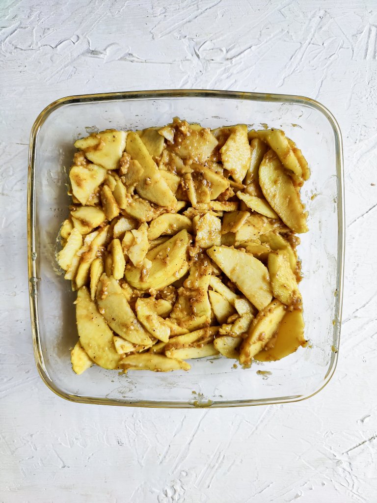 - Put this mixture on the apples and mix well so that all the pieces are coated
