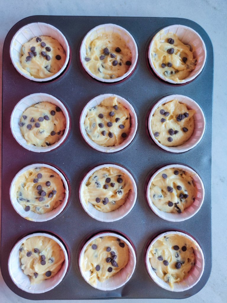 - Sprinkle some chips on top of each muffin