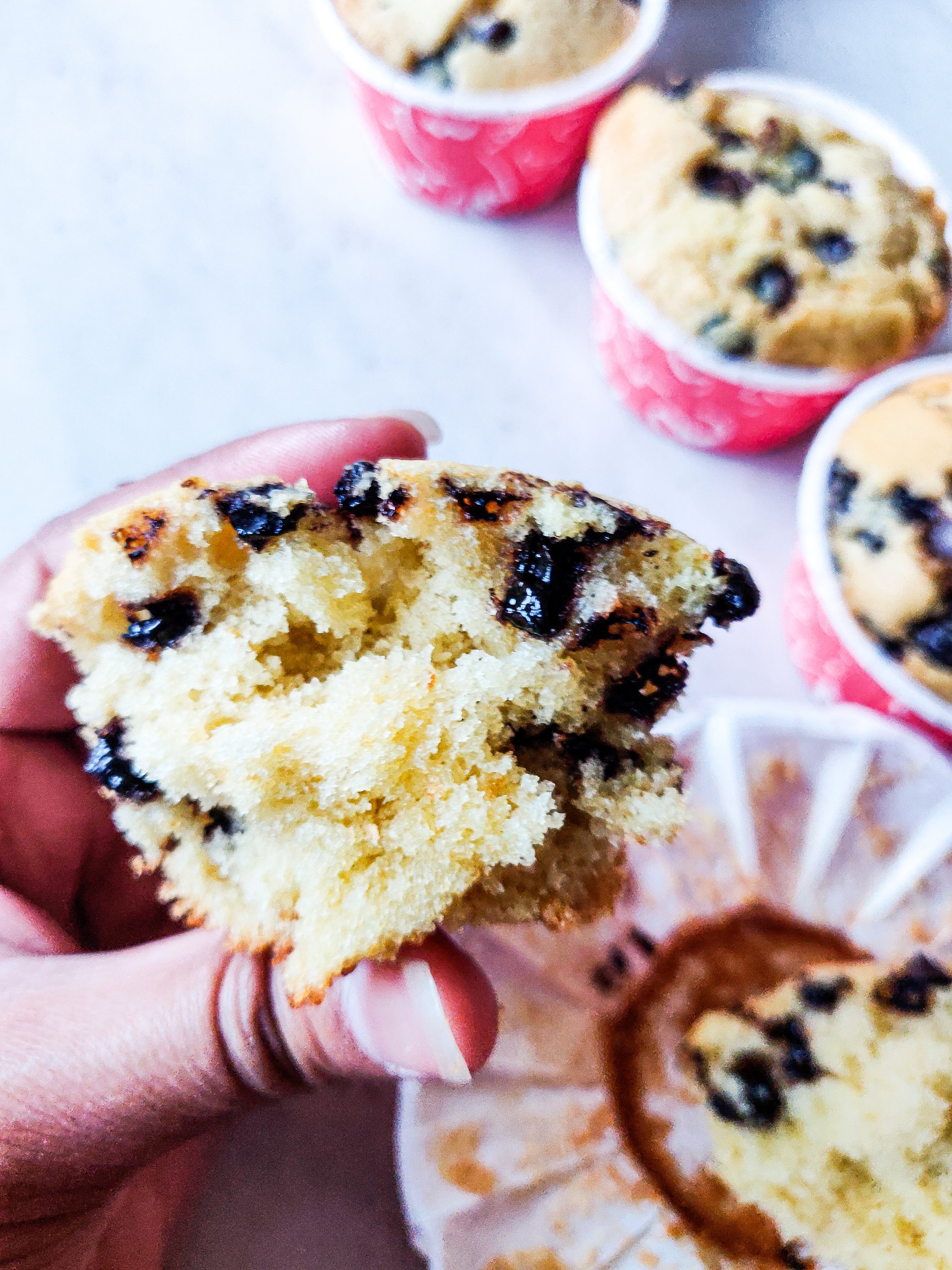 The recipe is similar to a regular muffin, with a swap of the flour and honey instead of sugar. Use good quality chocolate chips to get them to be just the right amount of melty inside and on top of the muffin 🤩