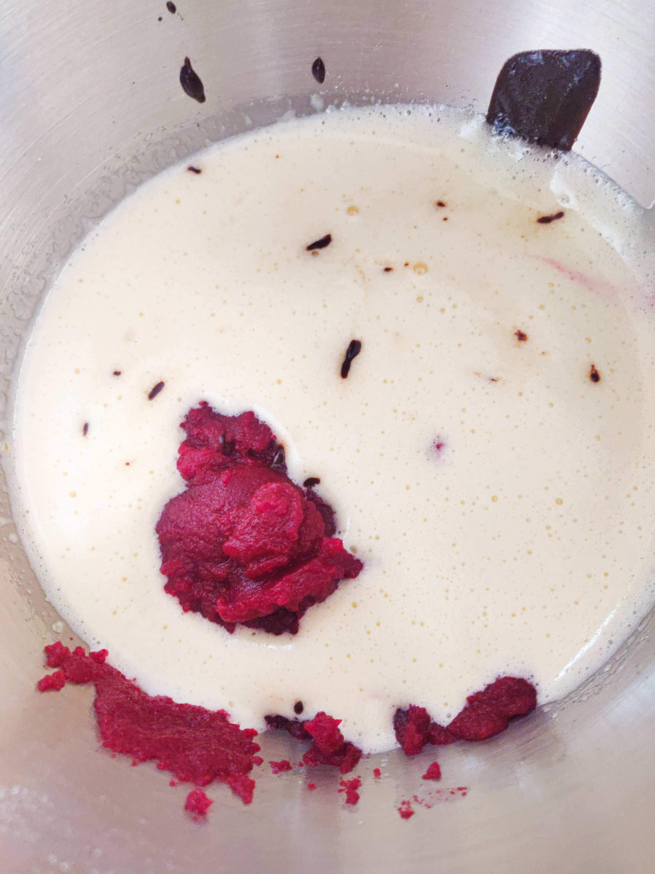 - Add the chocolate+butter sauce and pureed beetroot to the egg+sugar bowl and whisk gently till combined