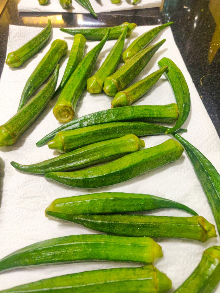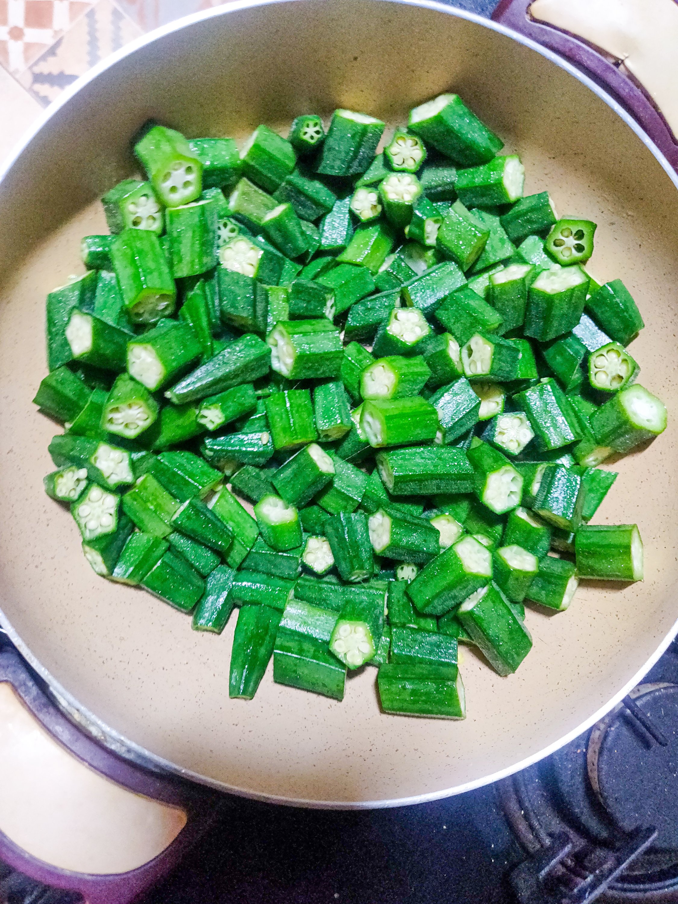- Wash and completely dry the bhindi. Chop into one inch pieces