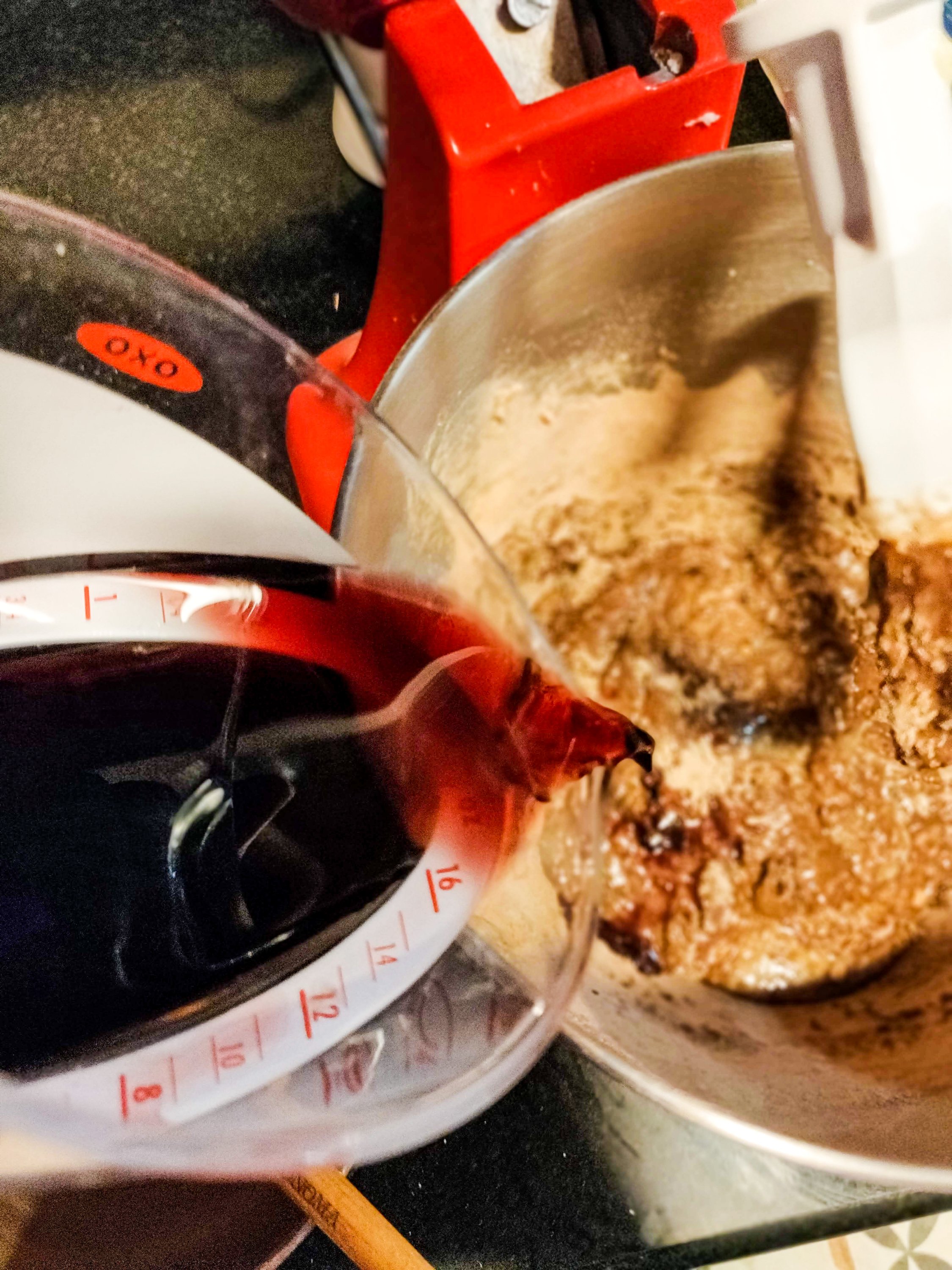 - Fold in the flour mix alternating with the remaining 100 ml of wine (start and end with the flour mix)