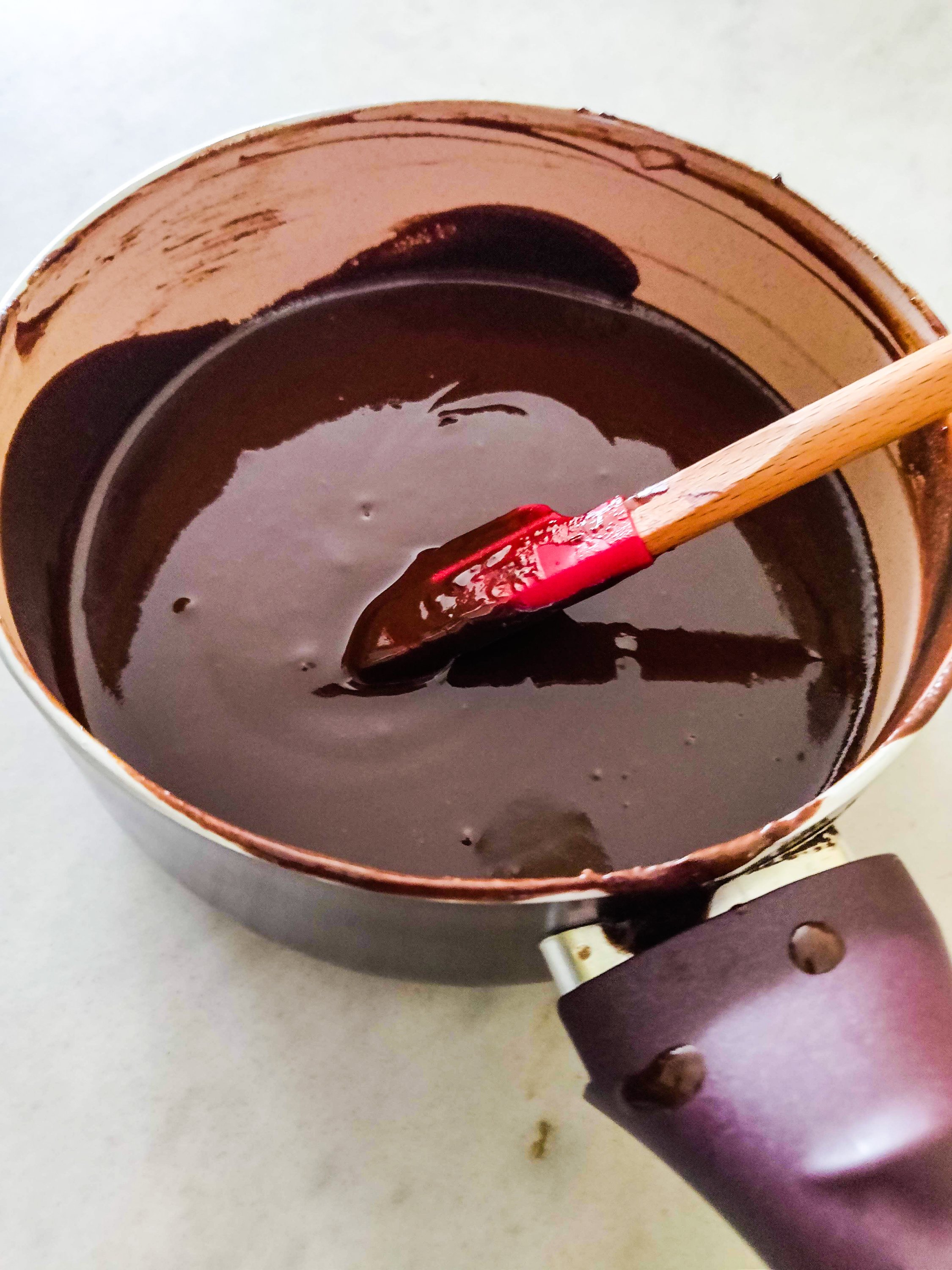 - To make the ganache, melt chocolate and butter in a saucepan till well mixed and glossy