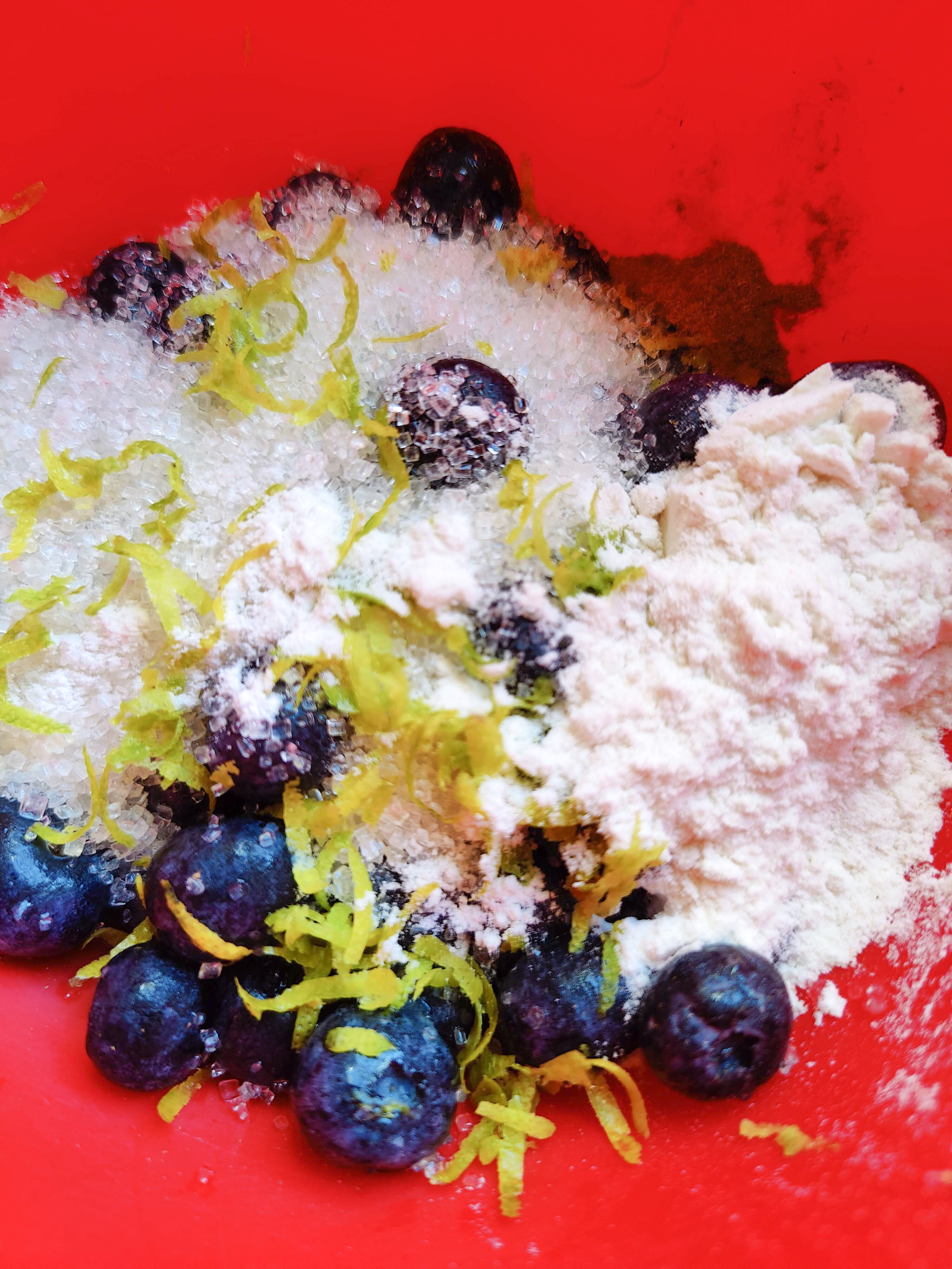 - In a small bowl, add 2 cups on blueberries with lemon zest, lemon juice, sugar, cinnamon and nutmeg. Use a fork to mash the berries lightly and mix well