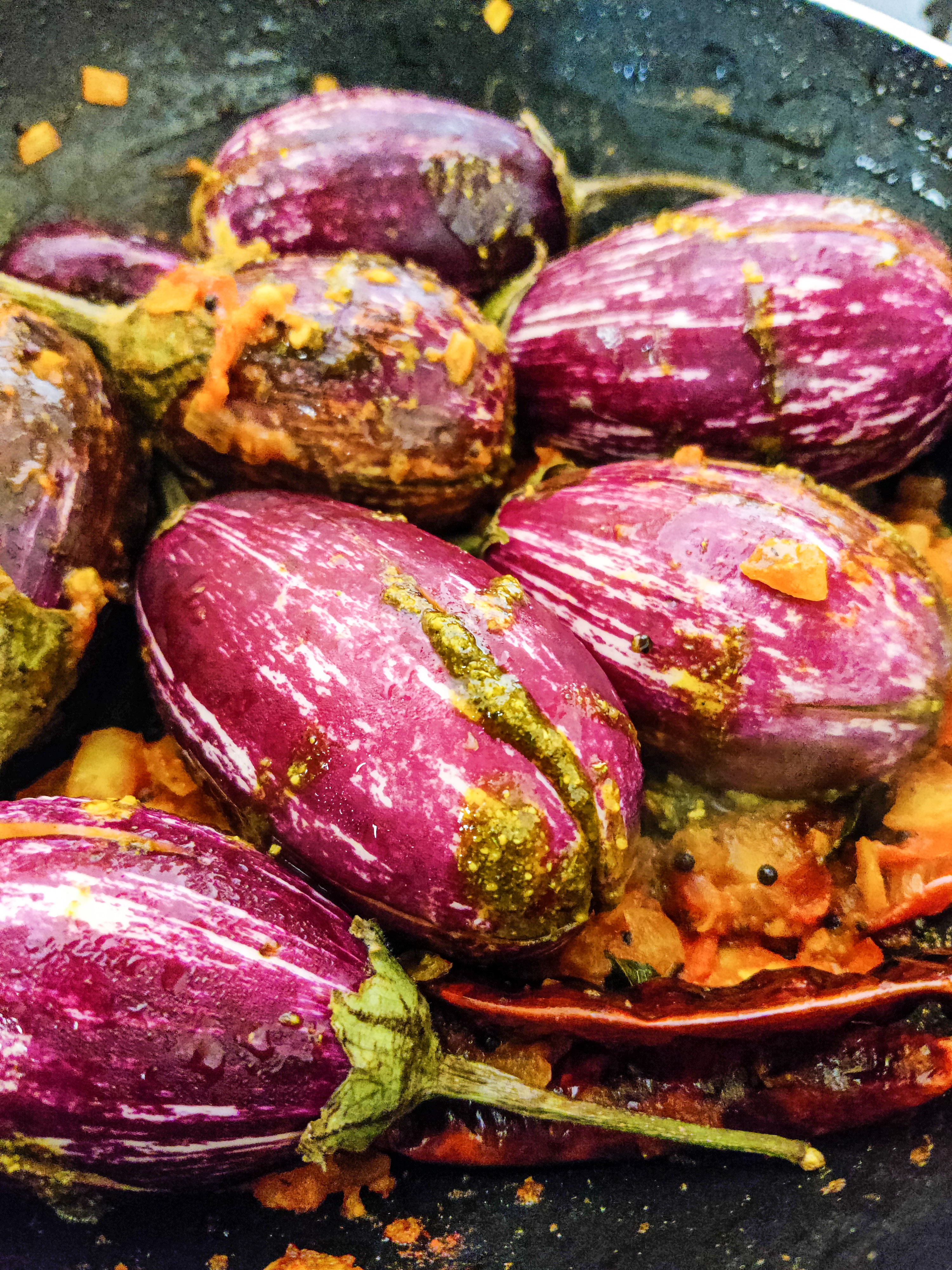 There are a lot of stuffed baigan recipes across different states, so I thought why not stuffing these small eggplants with podi instead?