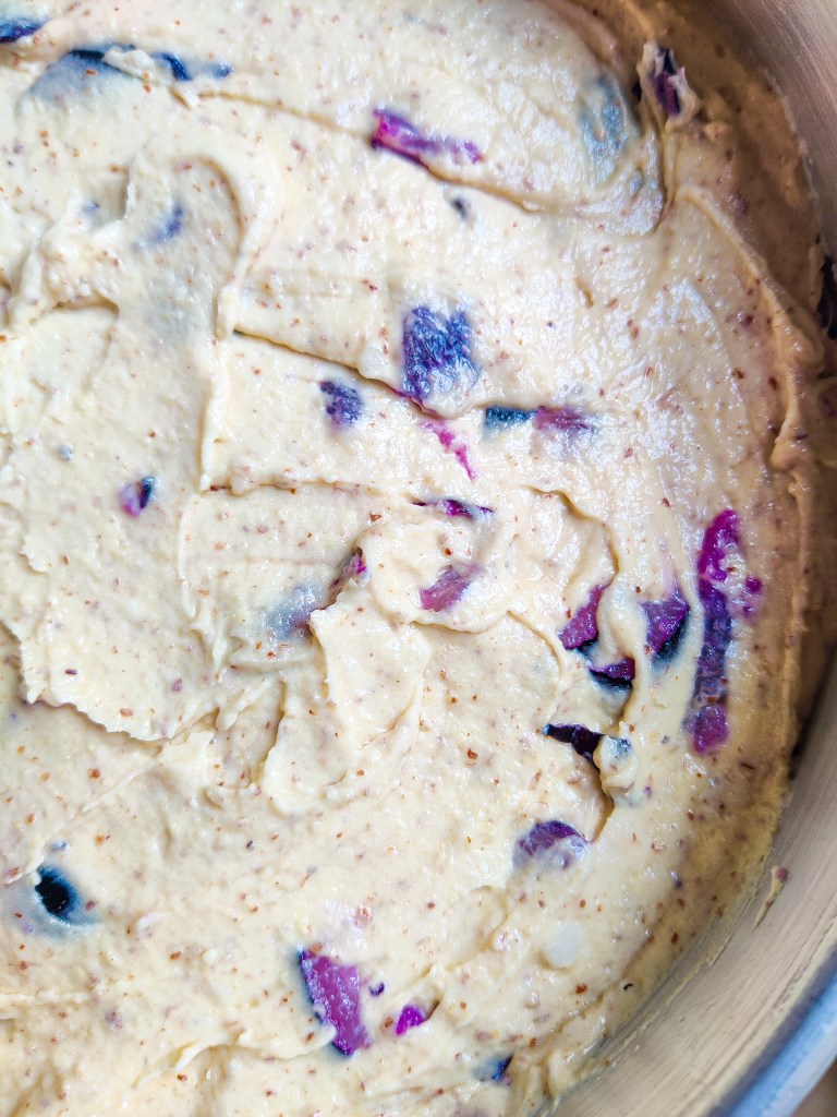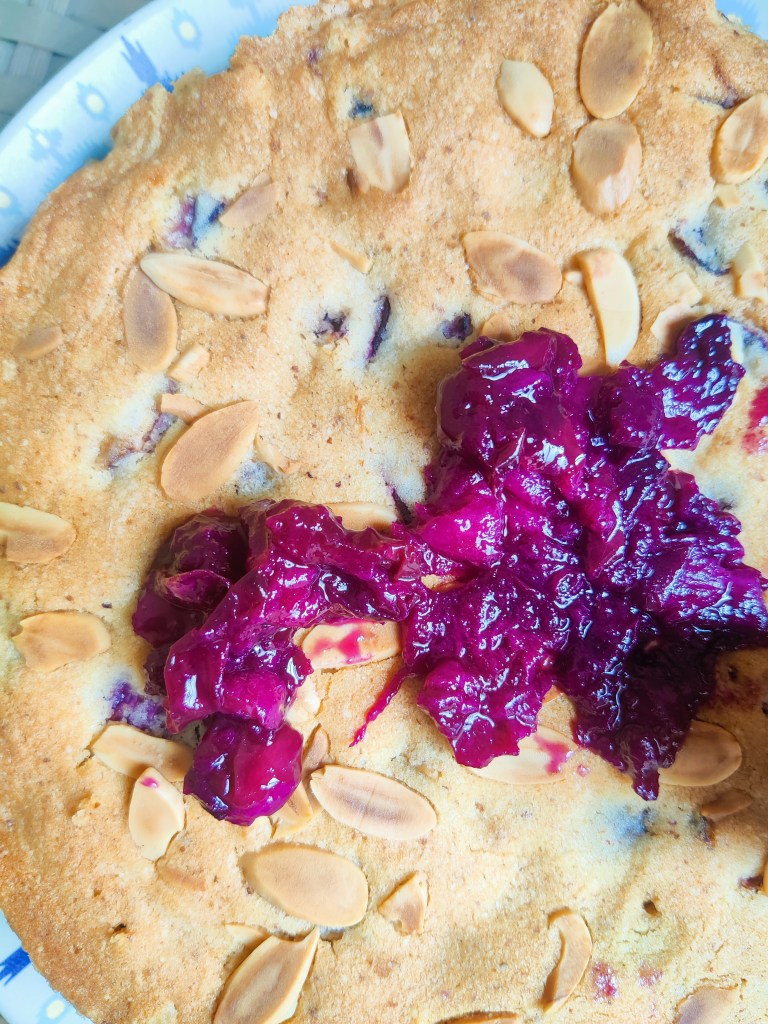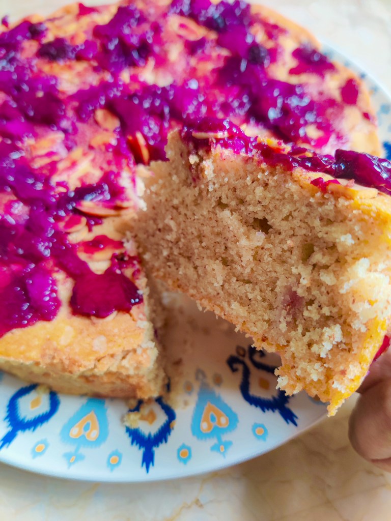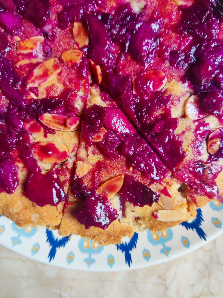 The jamuns are sliced up and added to the batter but also make for a delicious, sweet and sour compote to go on top of the cake. Different textures, but amazing flavours!