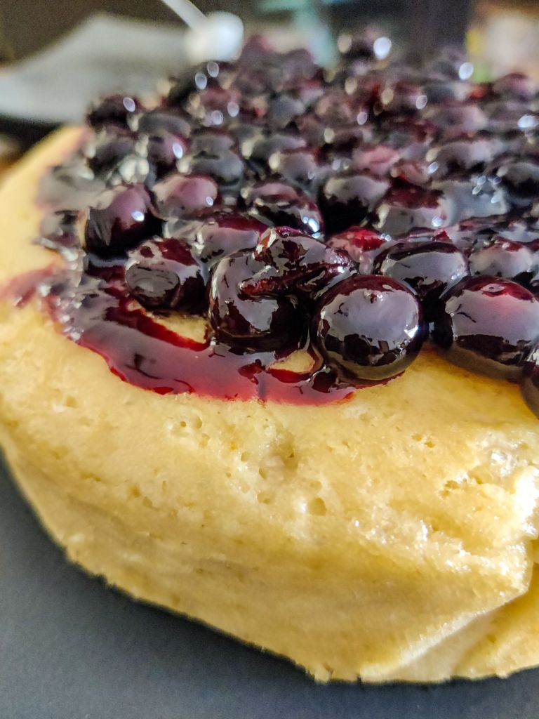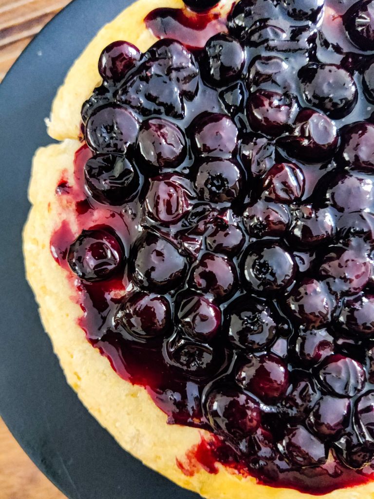 This is an easy lemon cake with a yum, tangy, slightly sweet blueberry compote on top.