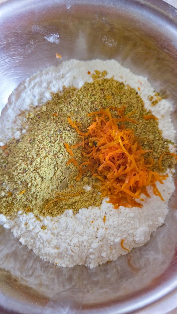 - In a small bowl, mix the flour, pistachio meal, salt, baking soda, baking powder and orange zest