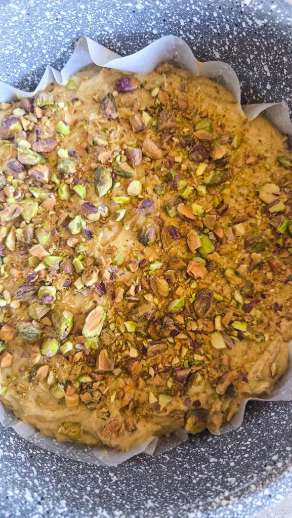 - Fold in 25g chopped pistachio and transfer the batter to the lined pan. Sprinkle 20g chopped pistachio on top and then bake at 175C for 45 mins till a tester comes out clean