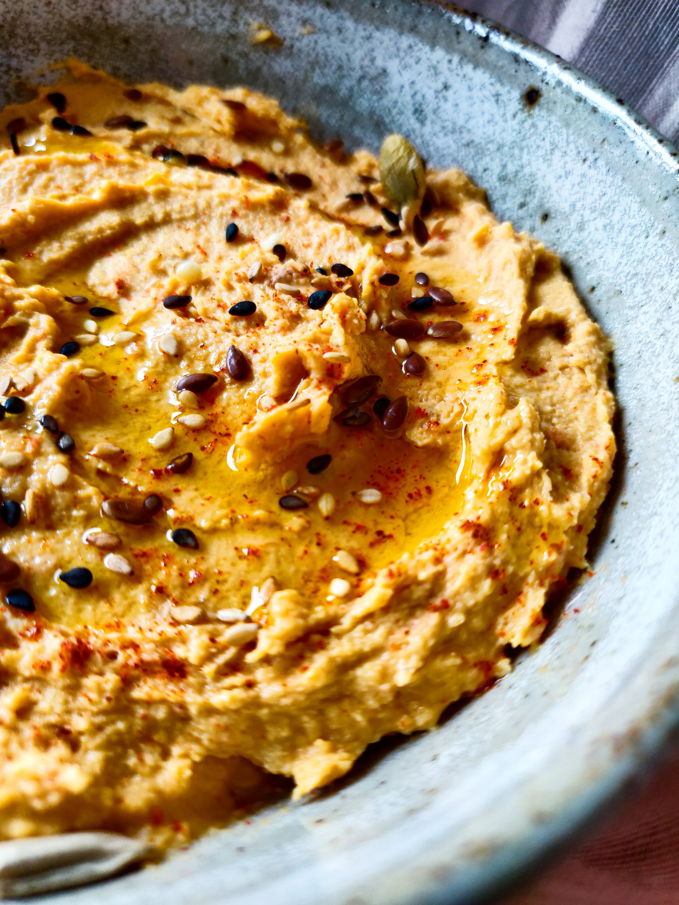 I love hummus! My basic recipe is easy, creamy, delicious and super versatile. This version is slightly jazzed up with the addition of roasted red bell peppers to make it extra special 🙂