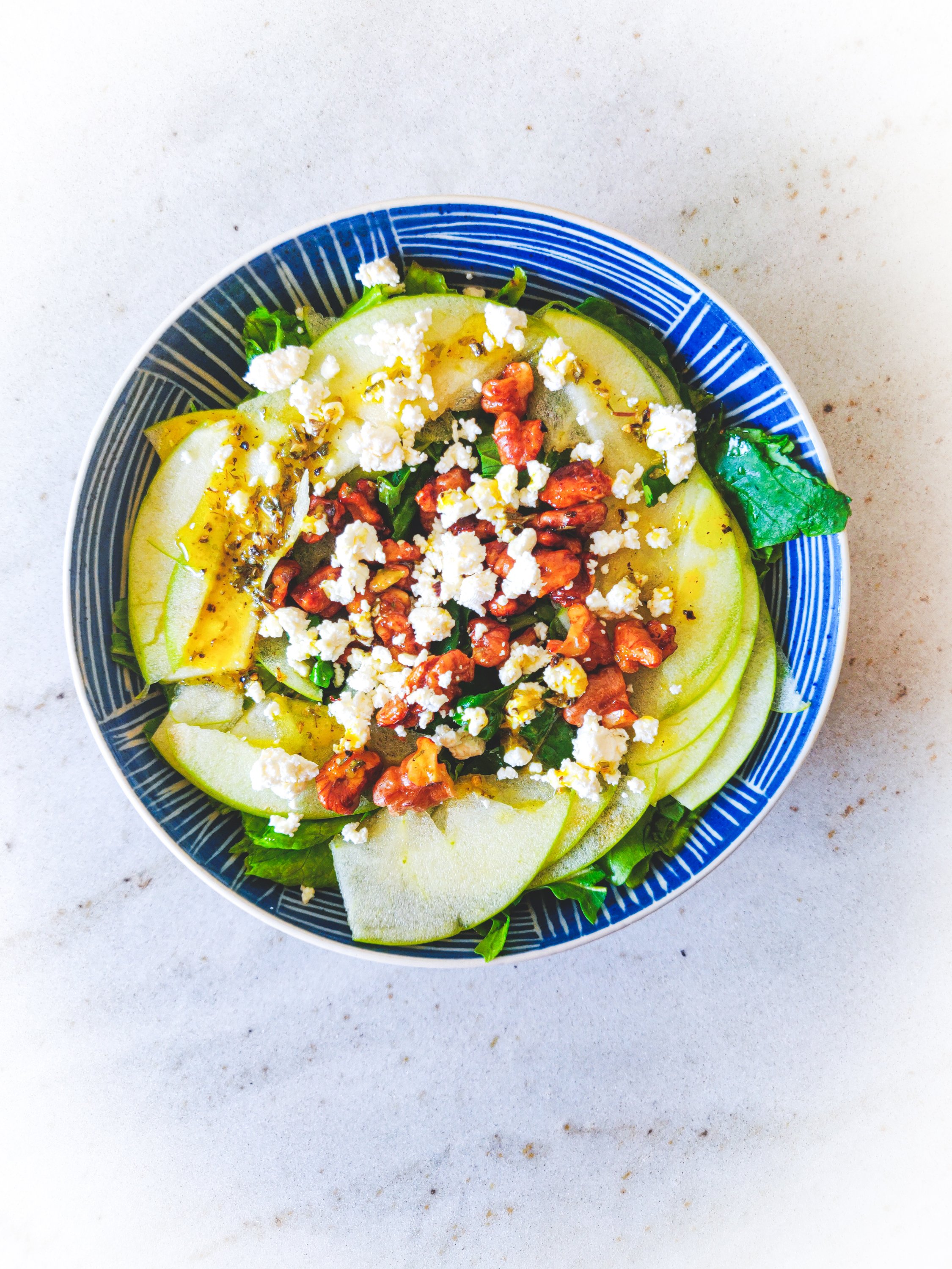 Feta is one of my favourite cheeses and I love the combination of fruit & feta in salad (like this watermelon salad). Another combination that works really well is green apple and feta. It is one of the freshest, brightest salads I’ve had in years!