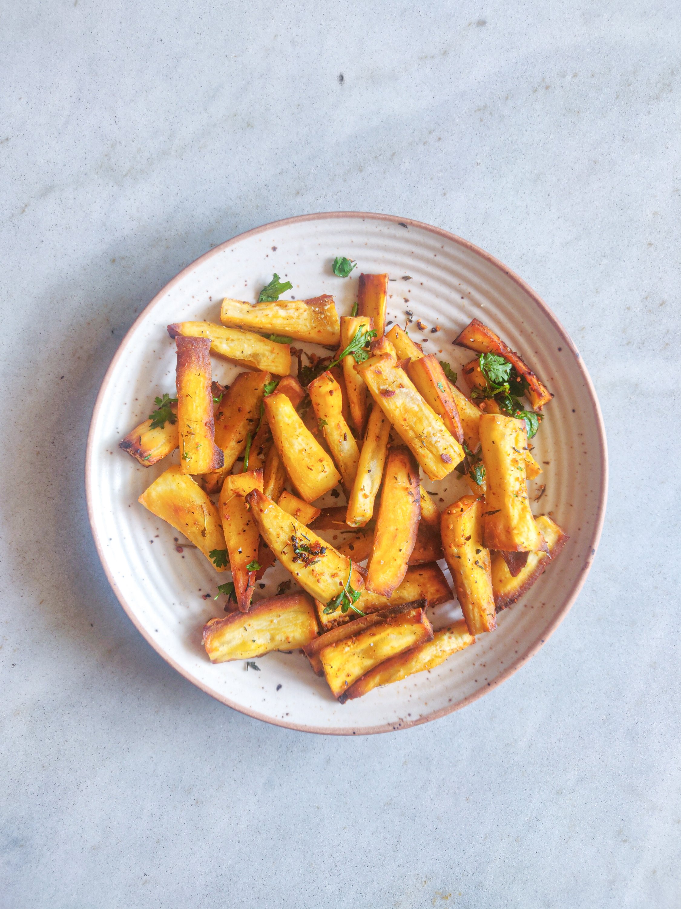 I love fries! Crispy, delicious and happiness inducing! For me, fries were always made of potatoes, but over the past 10 years or so I’ve tried some others too. Sweet potato fries are the most common of these and I actually really like them despite being wary to begin with. Given the need to be healthy, I’ve also been experimenting with ways to bake things vs fry them. Fries are super easy to bake and are a nice alternative to the heavily fried stuff we end up eating so often.