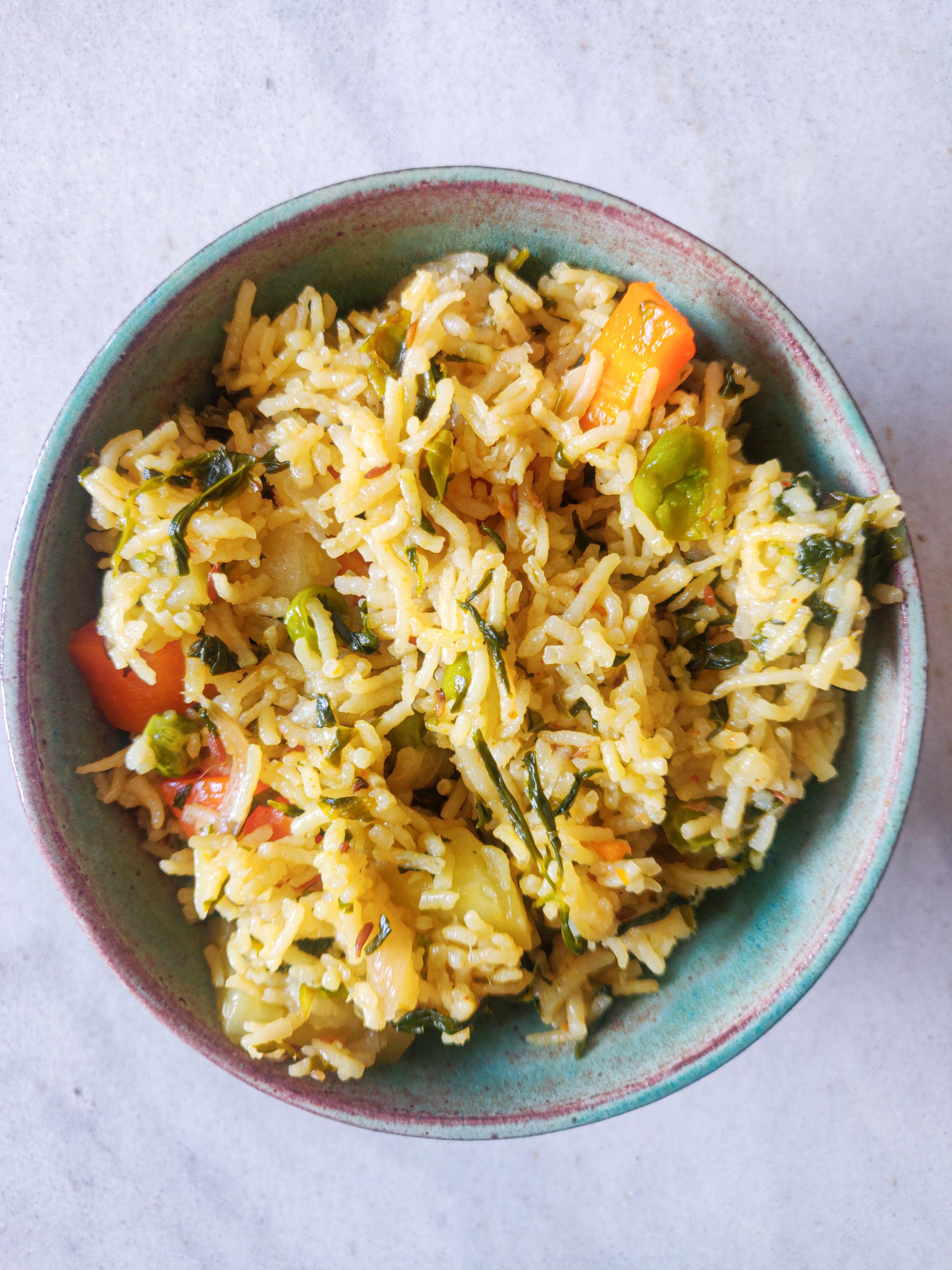 Yes, the rice lover is back! I’m always trying to find new ways to have rice and use it as a vehicle for flavour. It helps when it also becomes a way to improve my veggies & greens intake, like in this methi rice 🙂